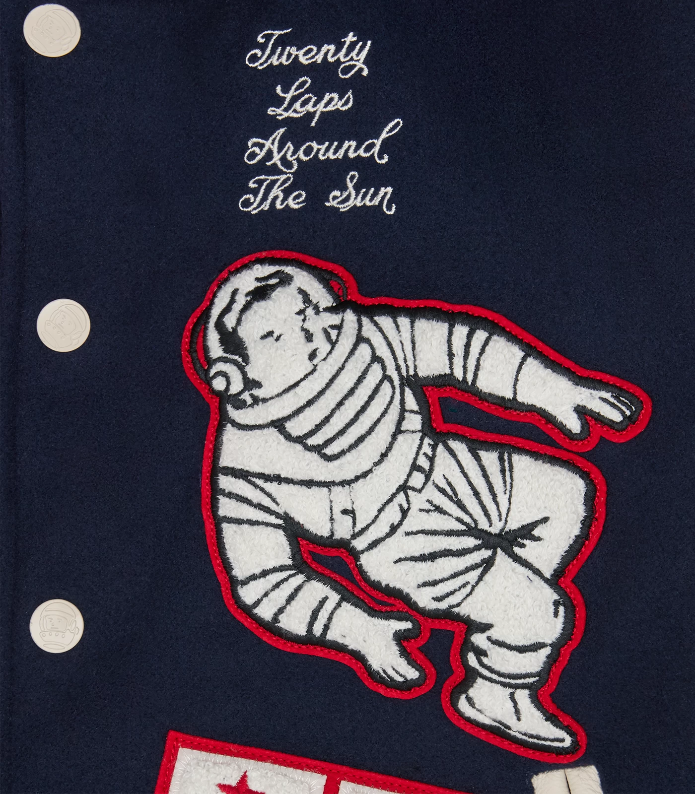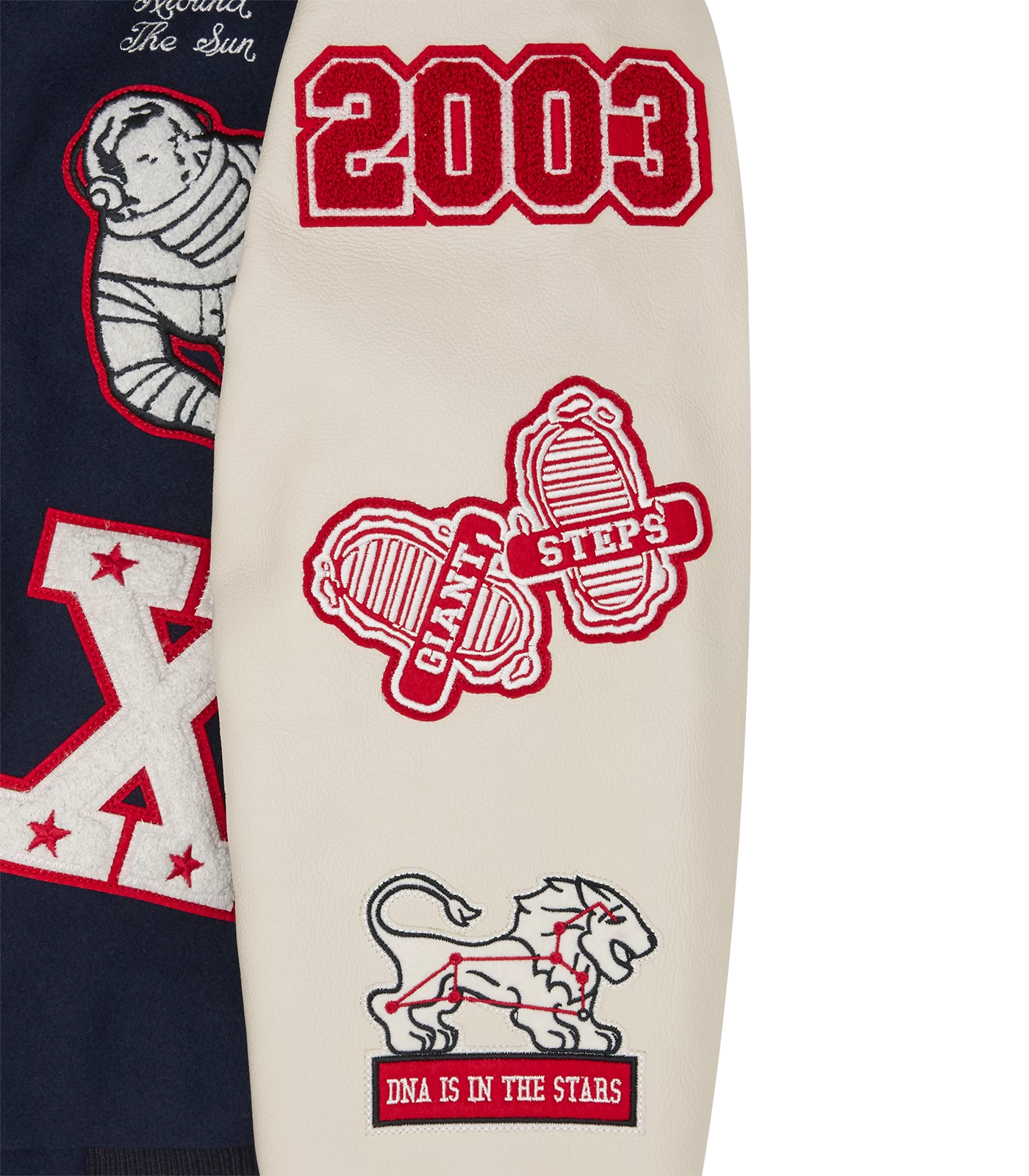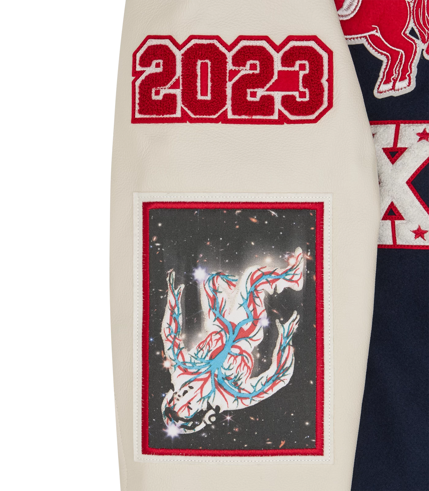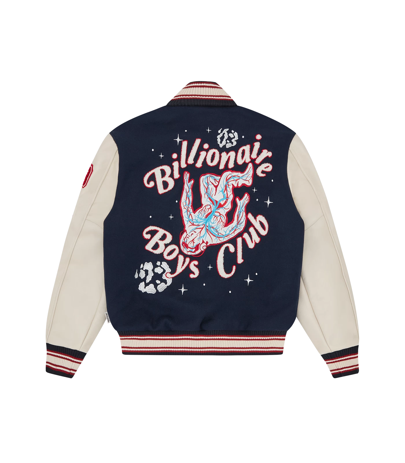 The 20th Anniversary Leather Sleeve Varsity Jacket arrives in a classic Billionaire Boys Club varsity silhouette and stands as the epitome of this cosmic narrative, seamlessly combining various elements. A Moon boot patch commemorates the brand taking its first step into the world in 2003, while Orion’s Belt inspires a horse charging into the future. The design intricately blends stars, astrology, and the intricate vascular system, symbolizing the profound connection between the solar system and human anatomy.