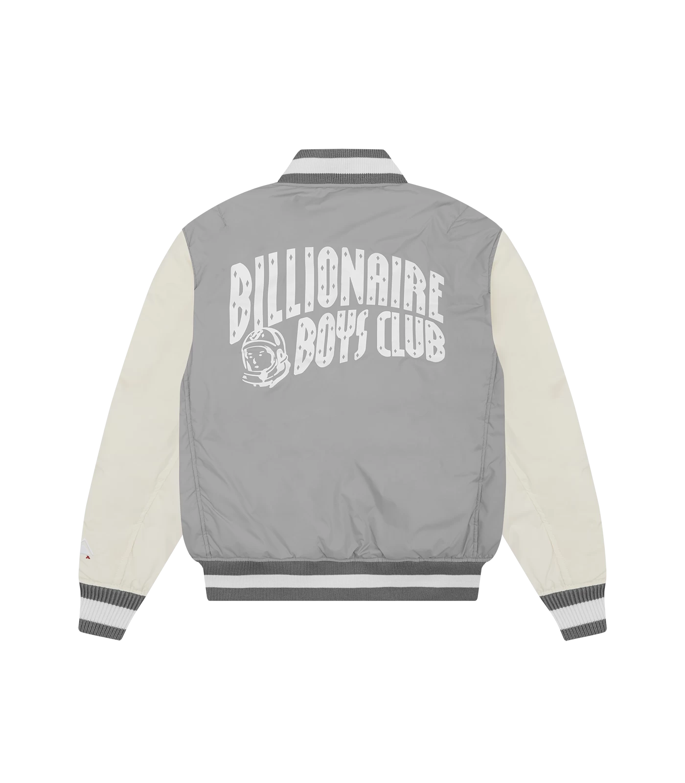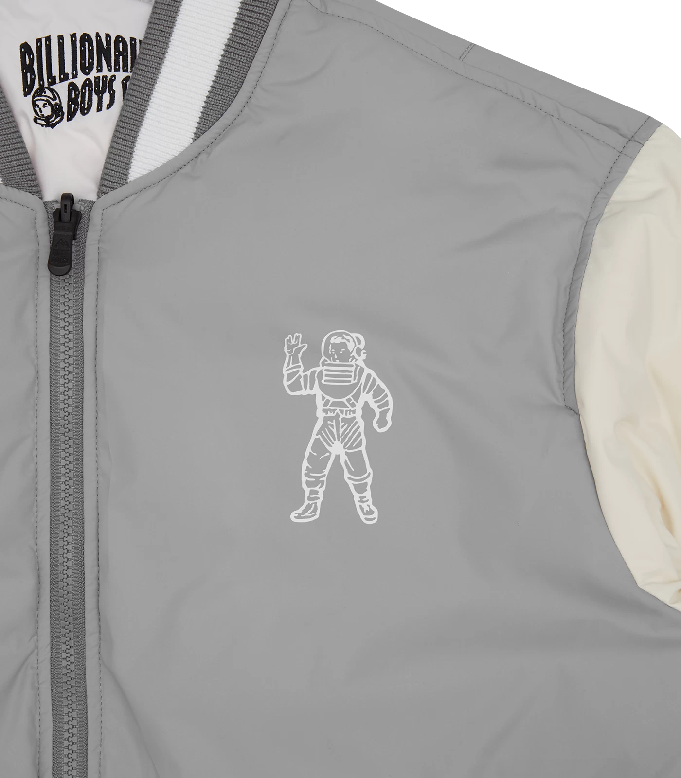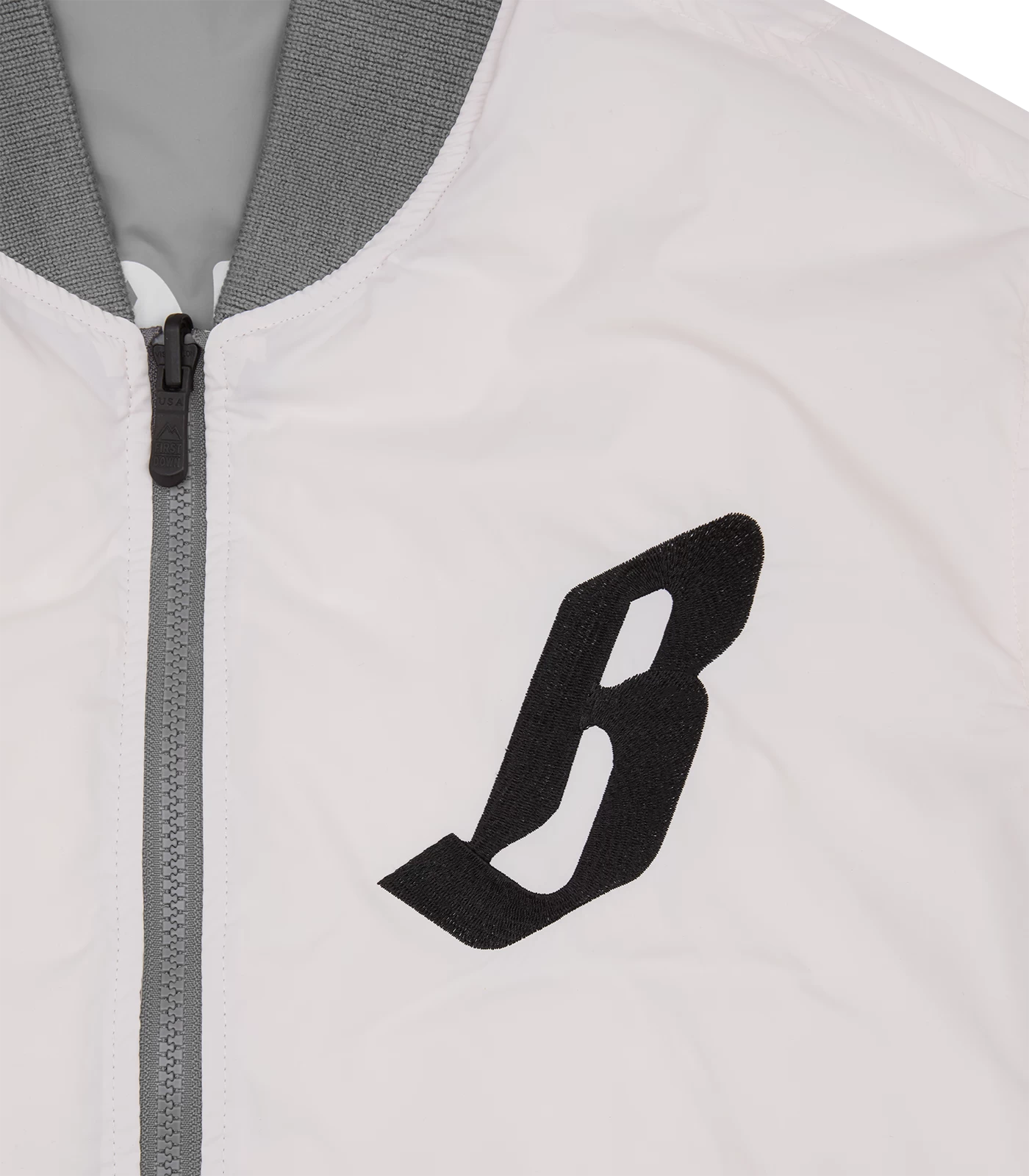 Billionaire Boys Club x First Down – Reversible Varsity Jacket, designed with a grey and pink pattern, with a pink inner. Crafted with duck feather, and finished with 2 zip closure pockets and a zip up front.