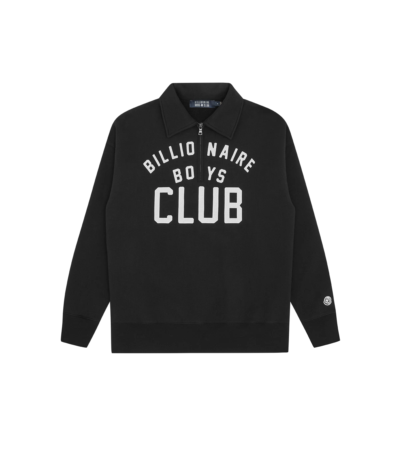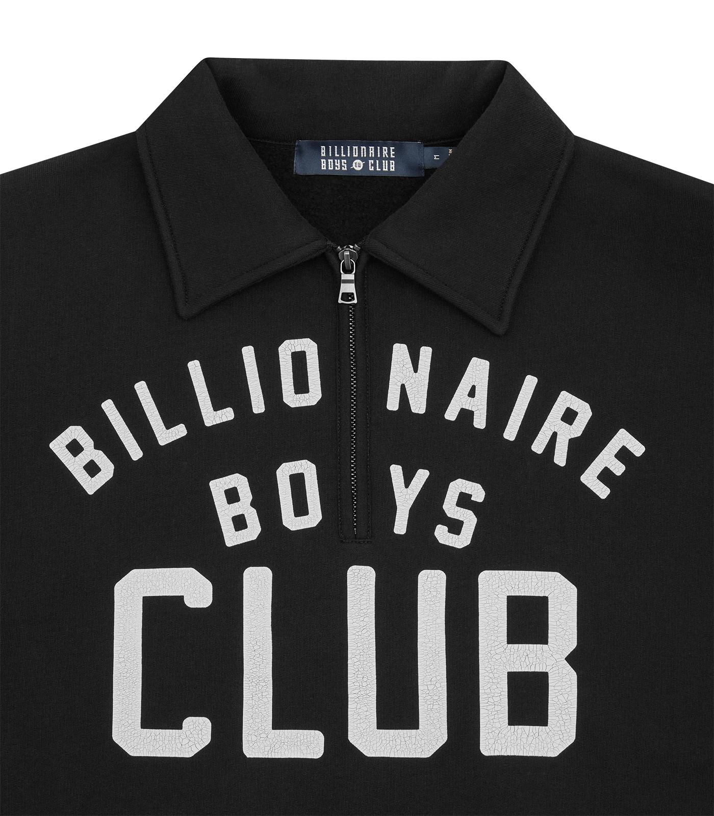 Billionaire Boys Club Spring ’24 – This Collared Half Zip Sweater presents a half zip at the collar and cracked Billionaire Boys Club lettering at chest.