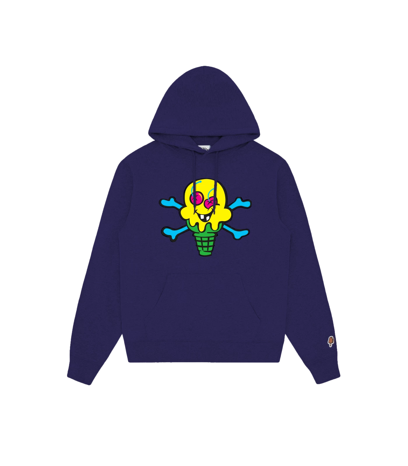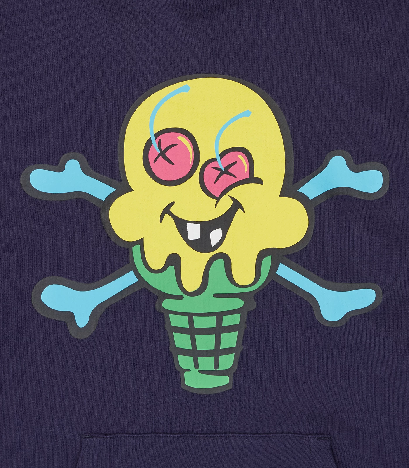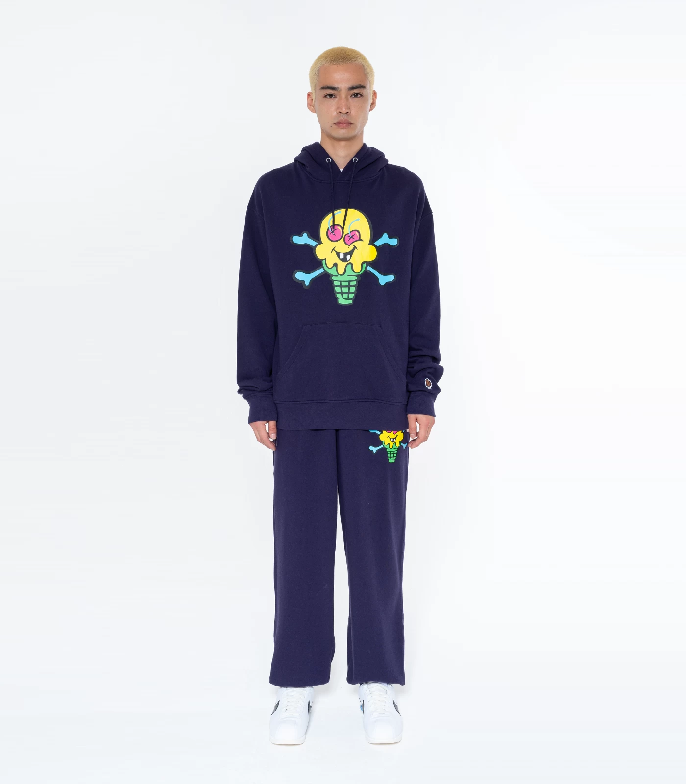 ICECREAM Pre-Spring ’24 – Cones & Bones Popover Hood, designed with a screen print logo at front, kangaroo pouch and drawstring hood. Matching sweatpants available.