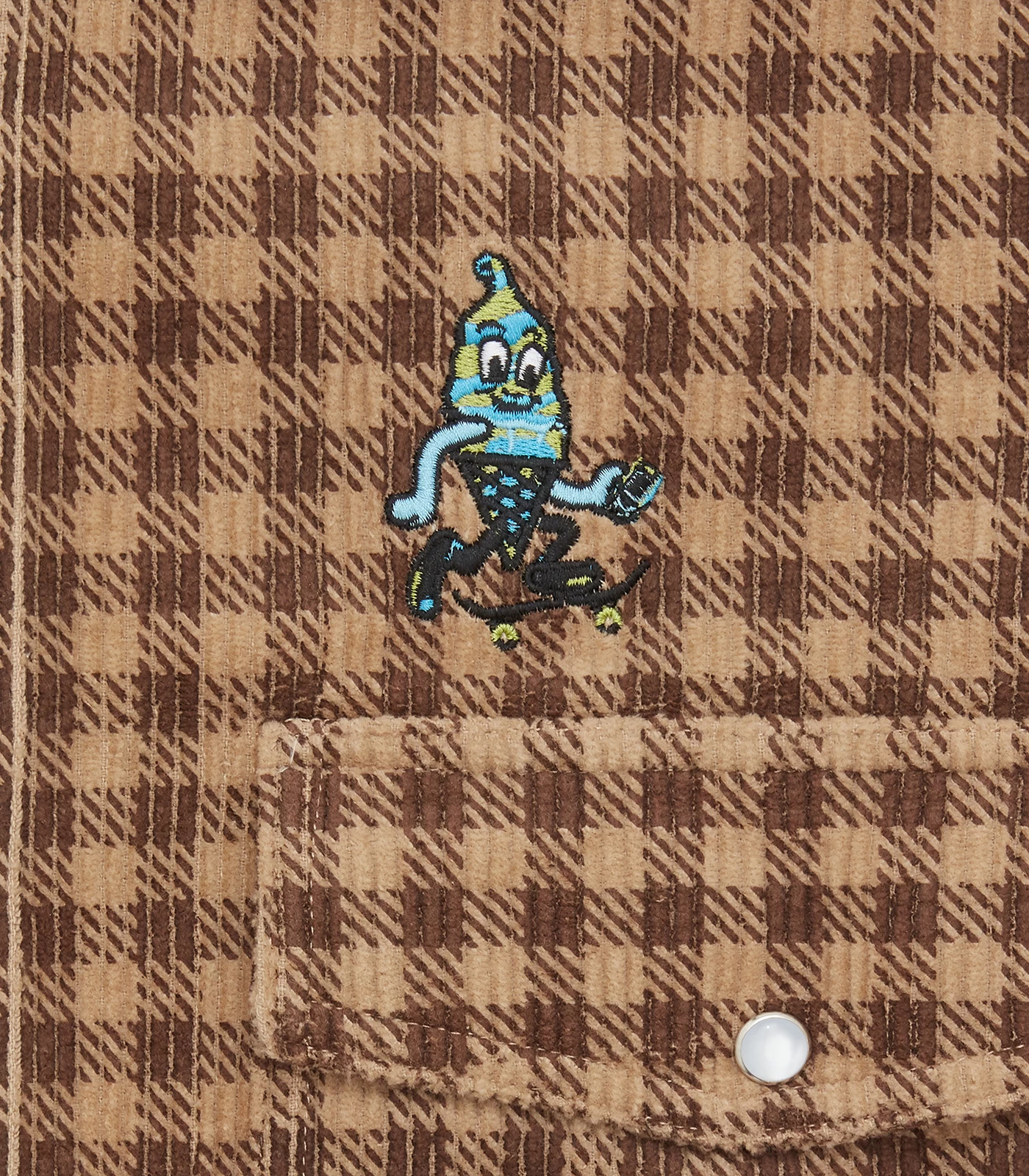 ICECREAM Spring ’24 – Button-down Corduroy Check Shirt featuring an embroidered chest signet and snap buttons.