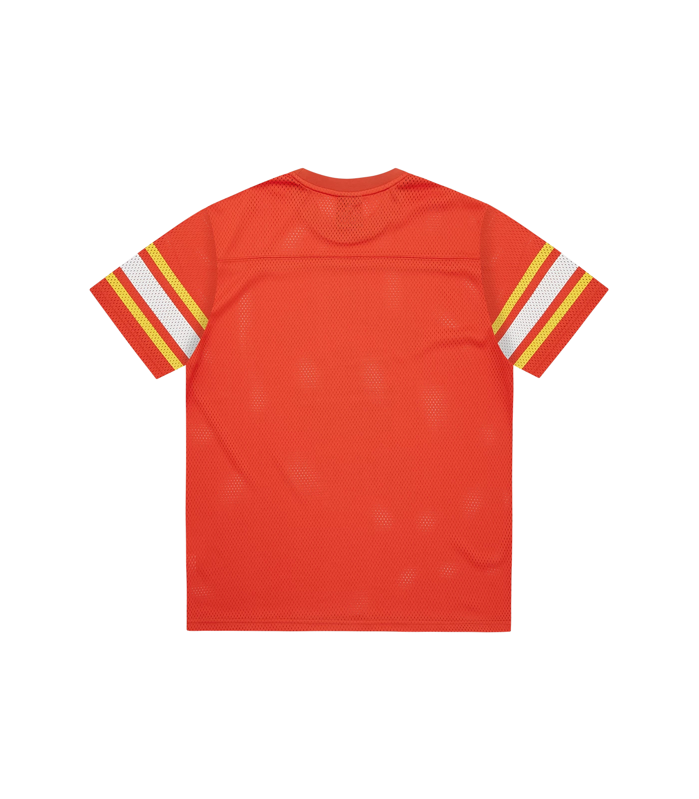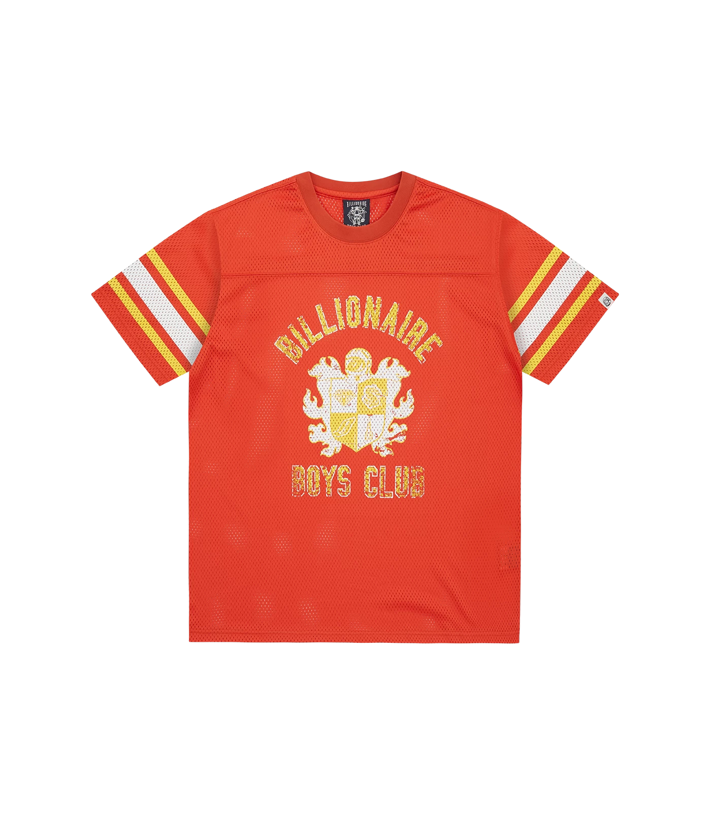 Billionaire Boys Club Spring ’24 – This Crest Logo Mesh Football Shirt presents a printed Billionaire Boys Club logo at front and contrasting stripes at sleeves.