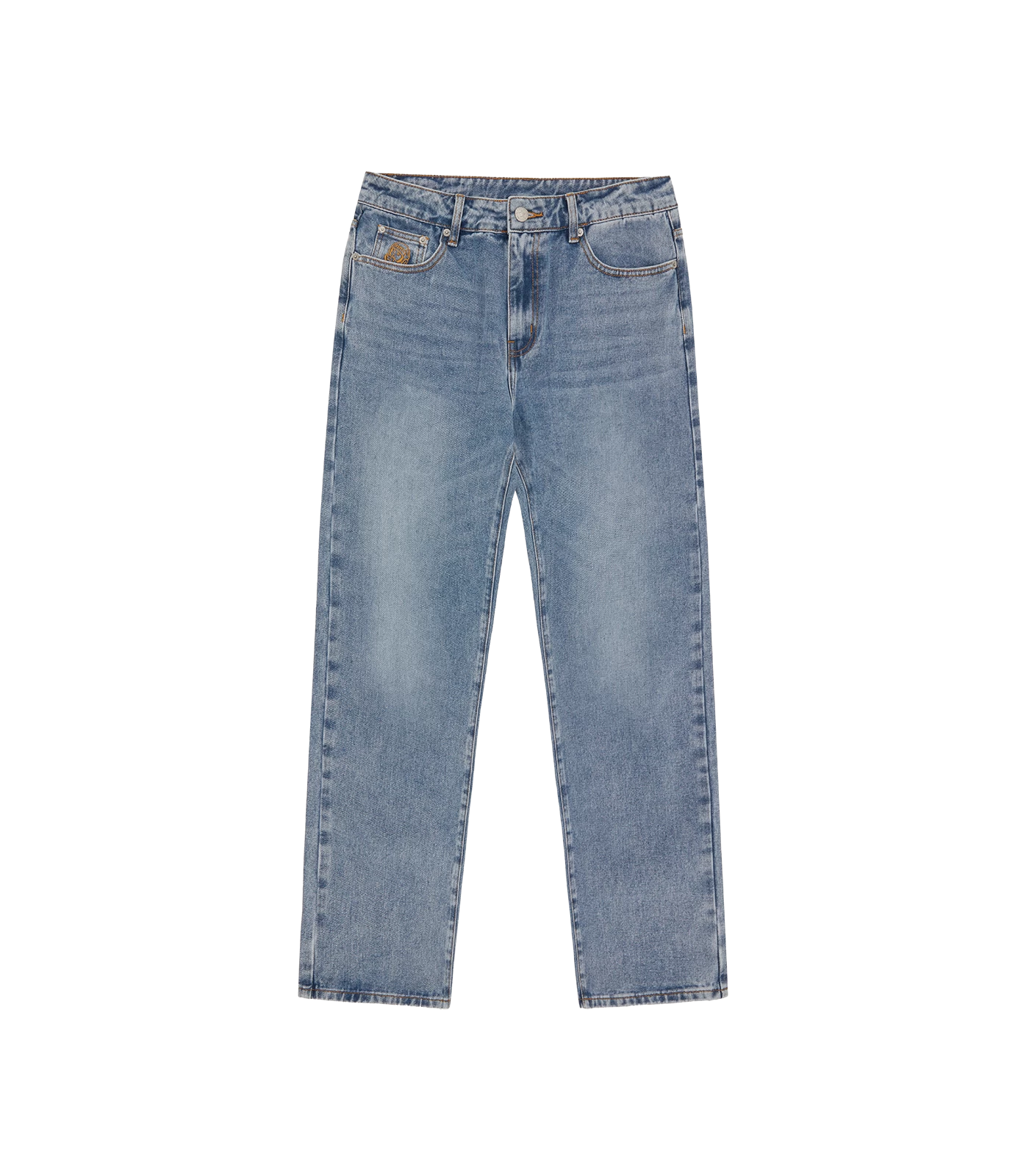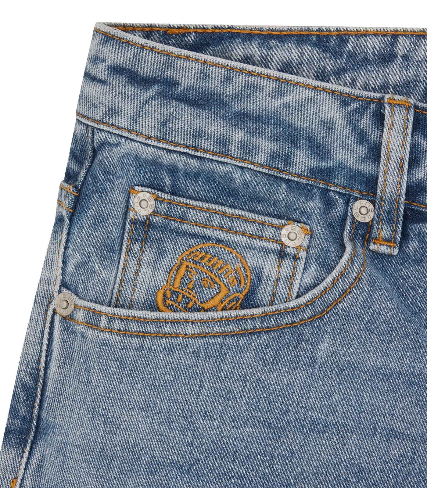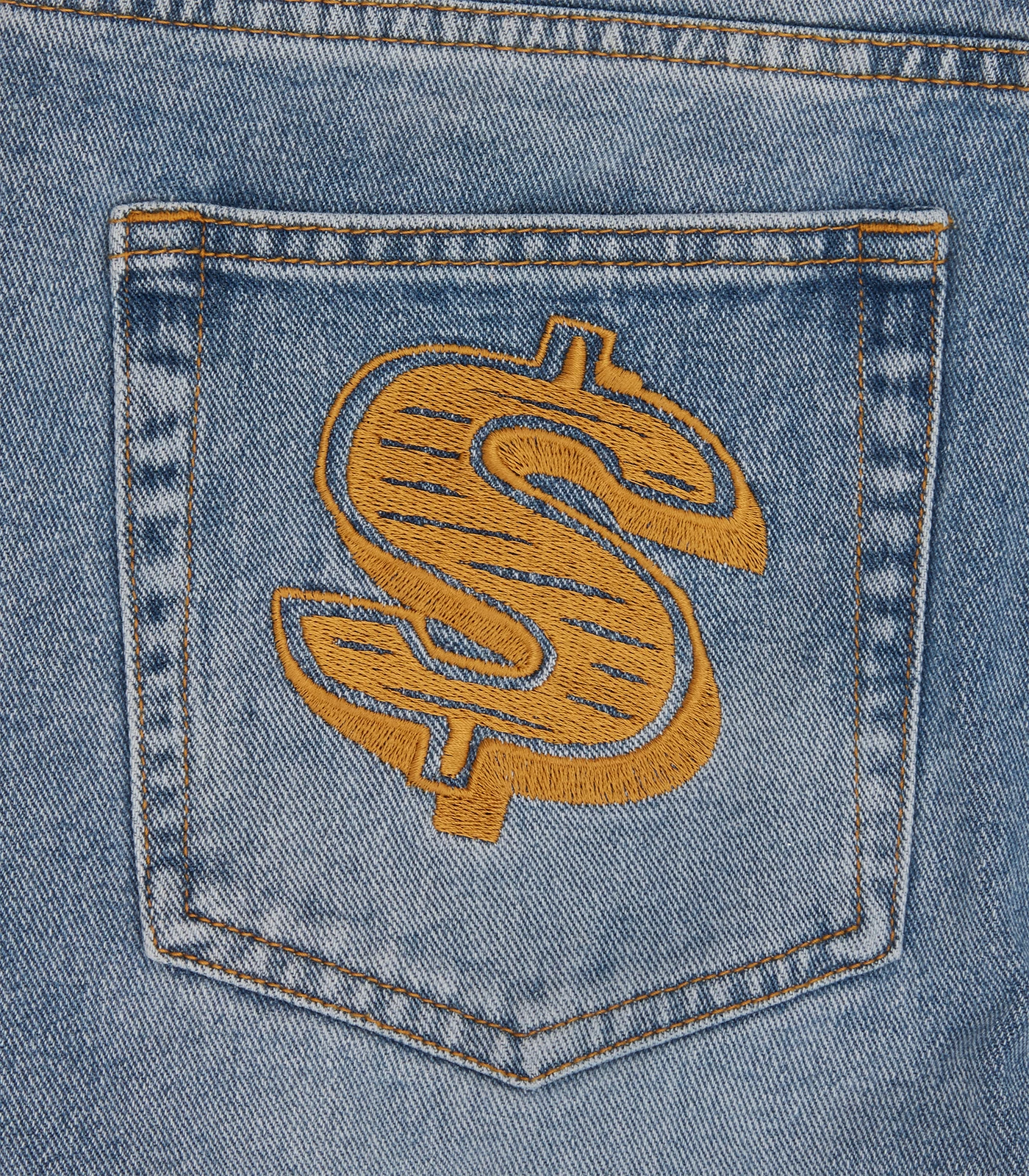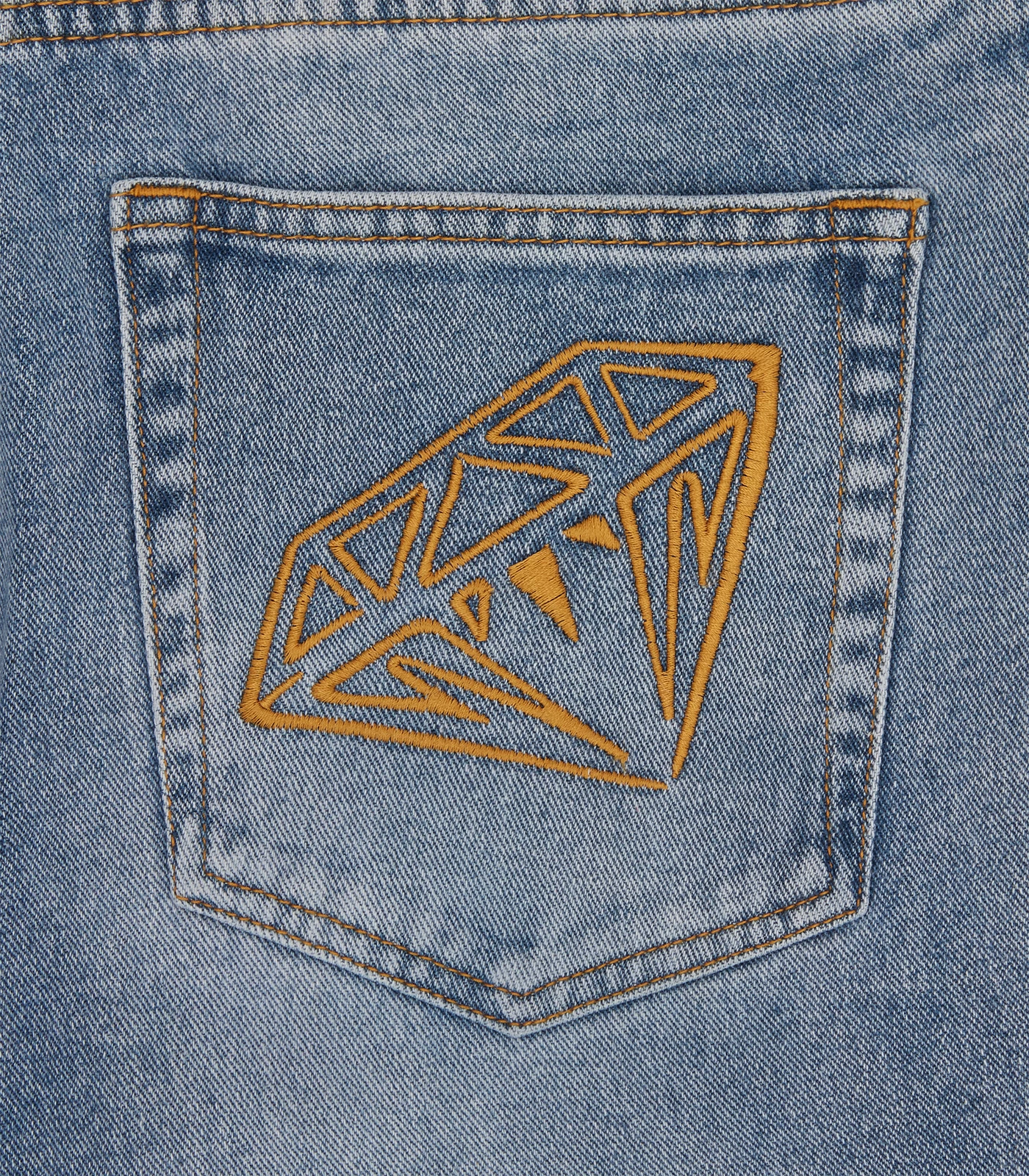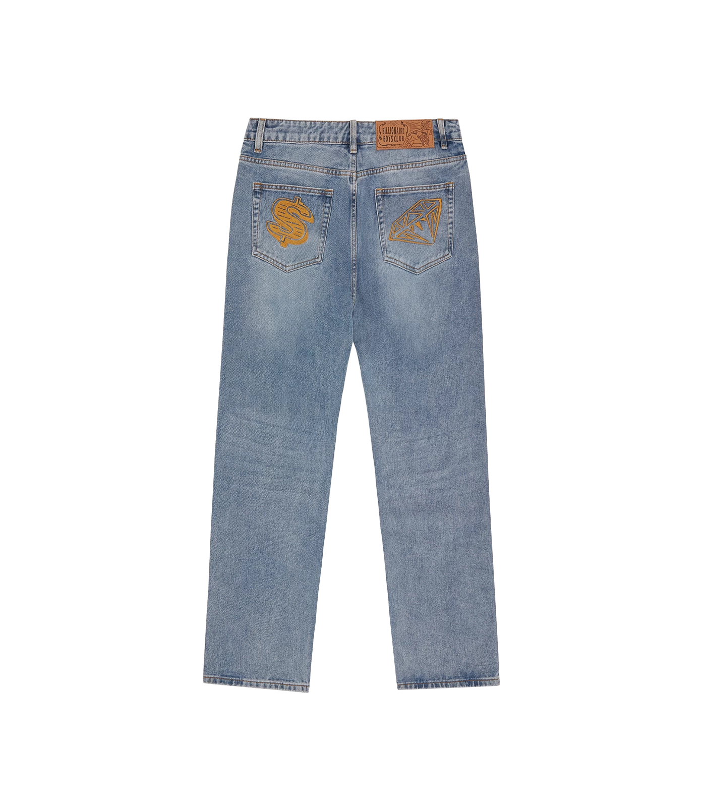 Billionaire Boys Club Spring ’24 – Diamonds & Dollar Embroidered Denim Pants in stonewash blue presenting the dollar and diamond logos embroidered at back pockets.