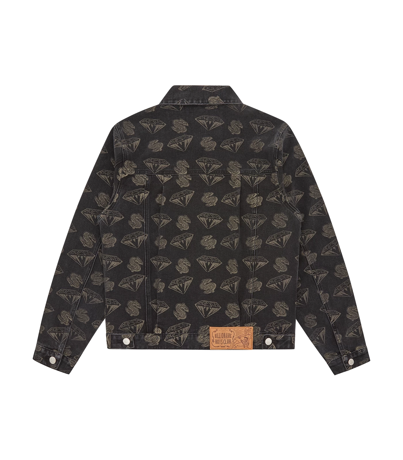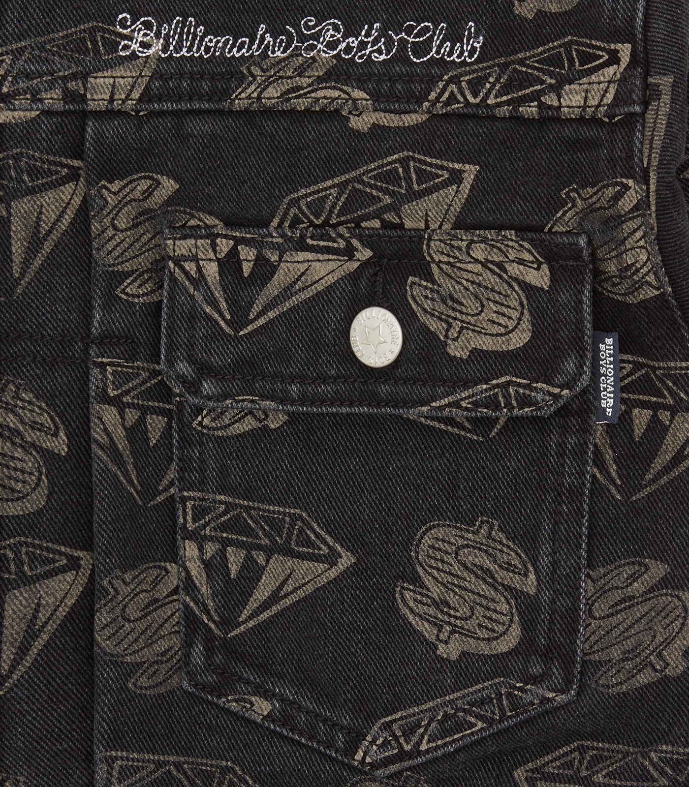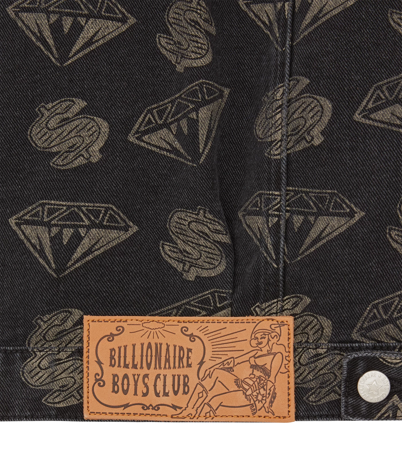 Billionaire Boys Club Pre-Spring ’24 – Diamonds & Dollars all over printed denim jacket in black.