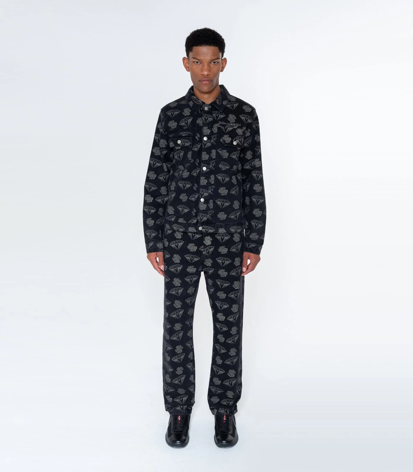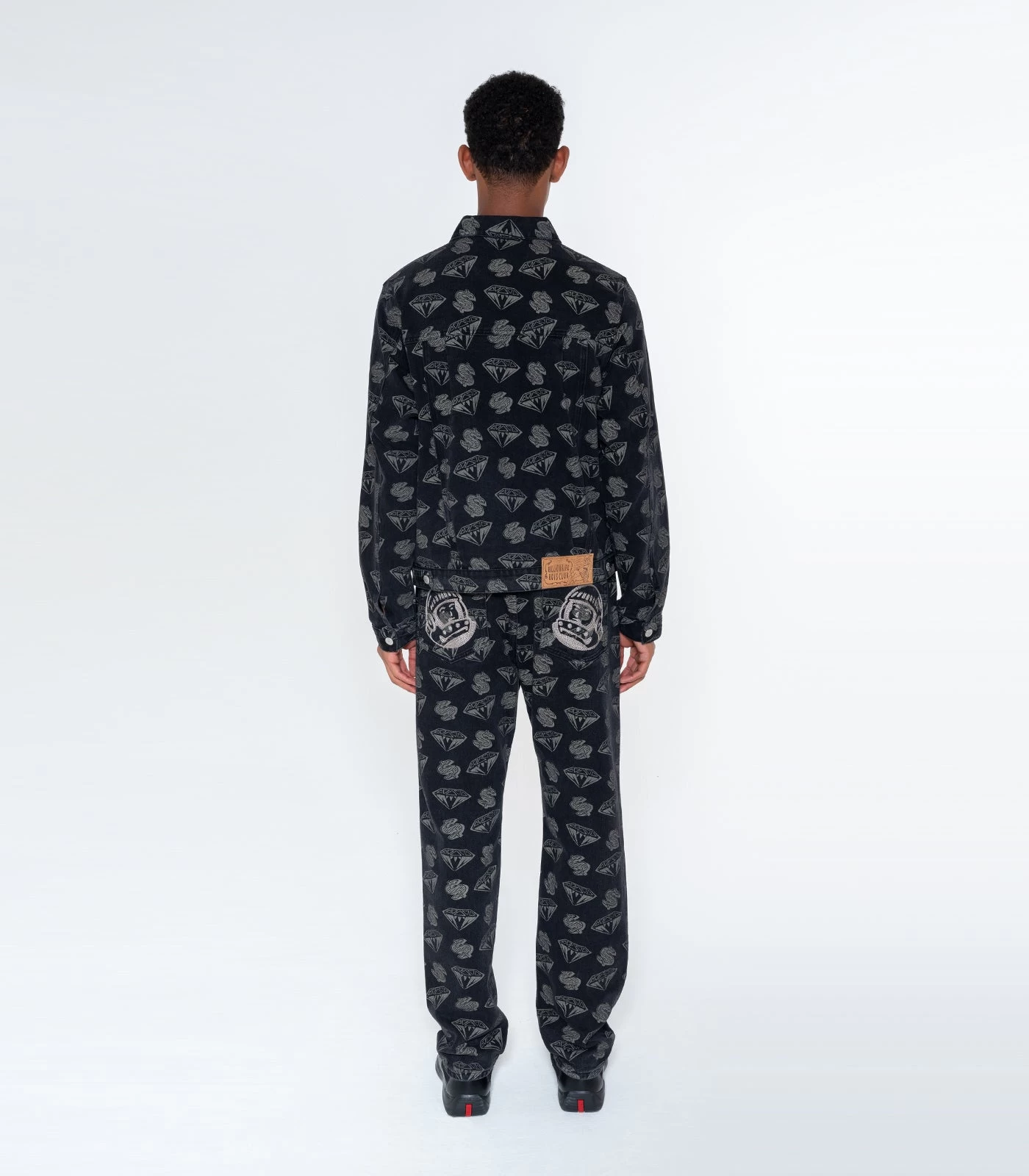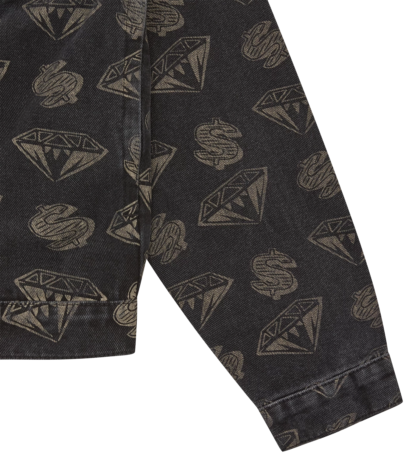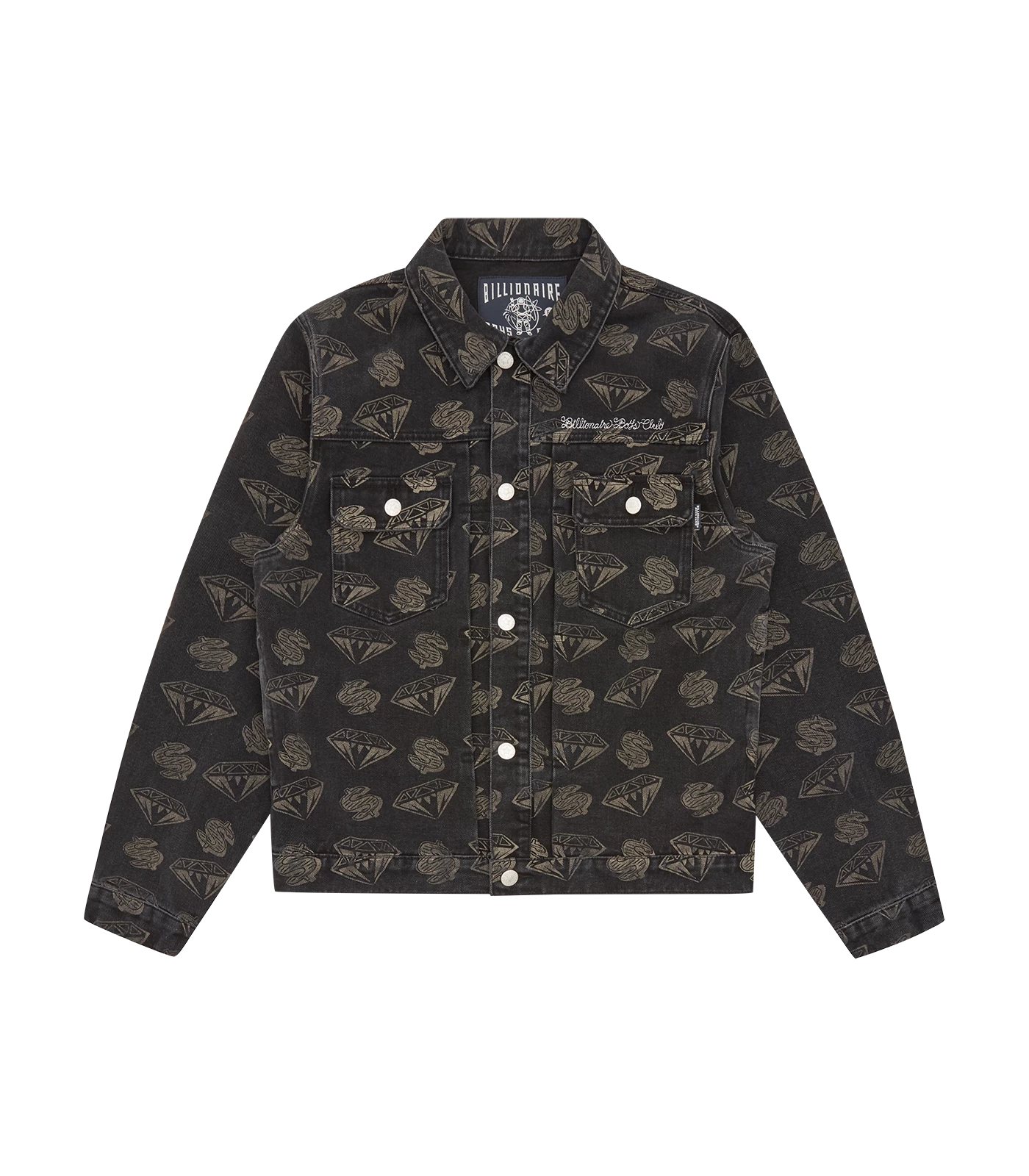 Billionaire Boys Club Pre-Spring ’24 – Diamonds & Dollars all over printed denim jacket in black.