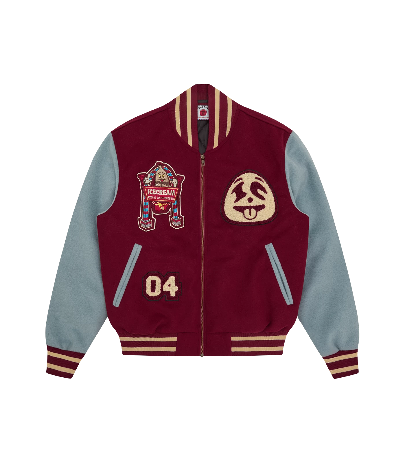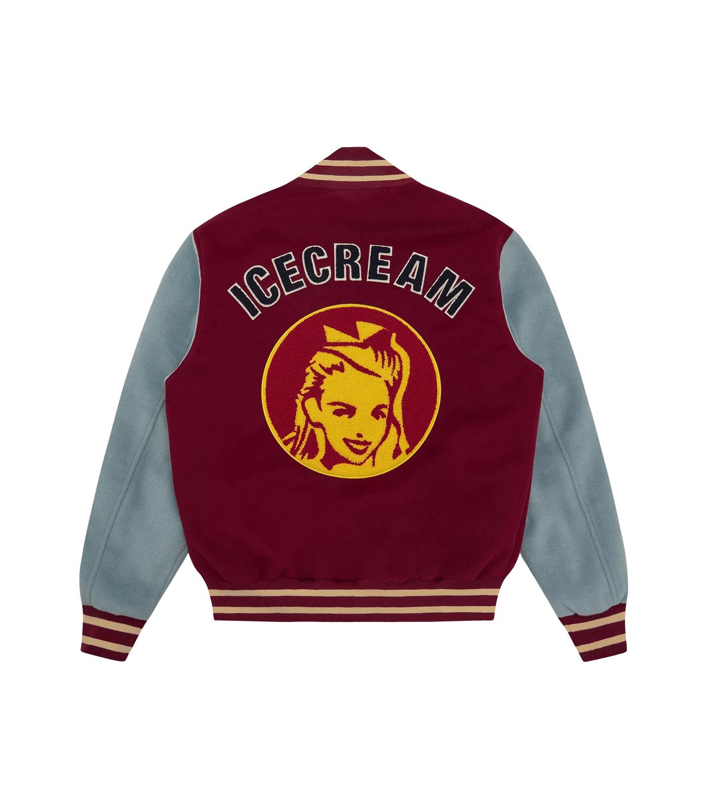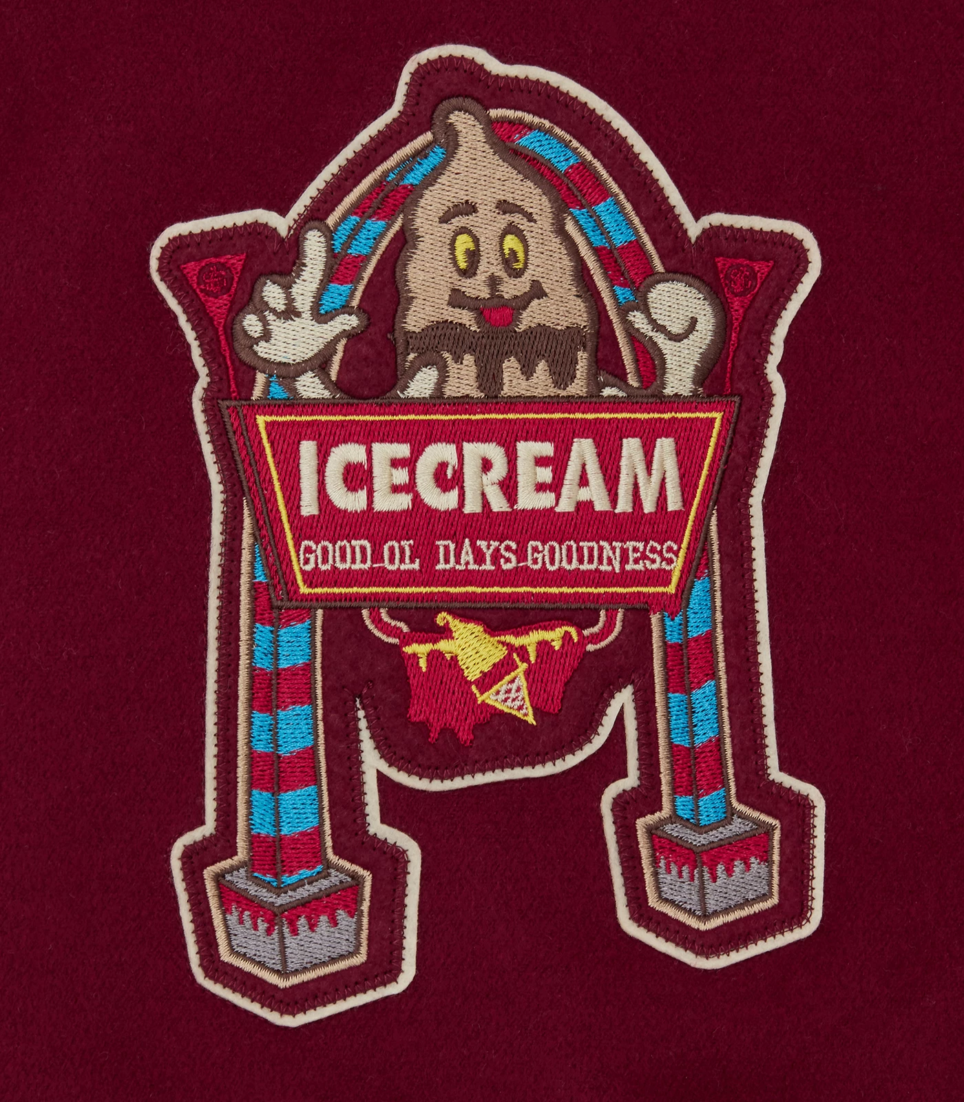 ICECREAM Spring ’24 – Featuring the Panda Face chenille logo and ICECREAM graphic at front, a quilted lining, and contrasting sleeves. It is finished with a chenille waitress and ICECREAM logo at back.
