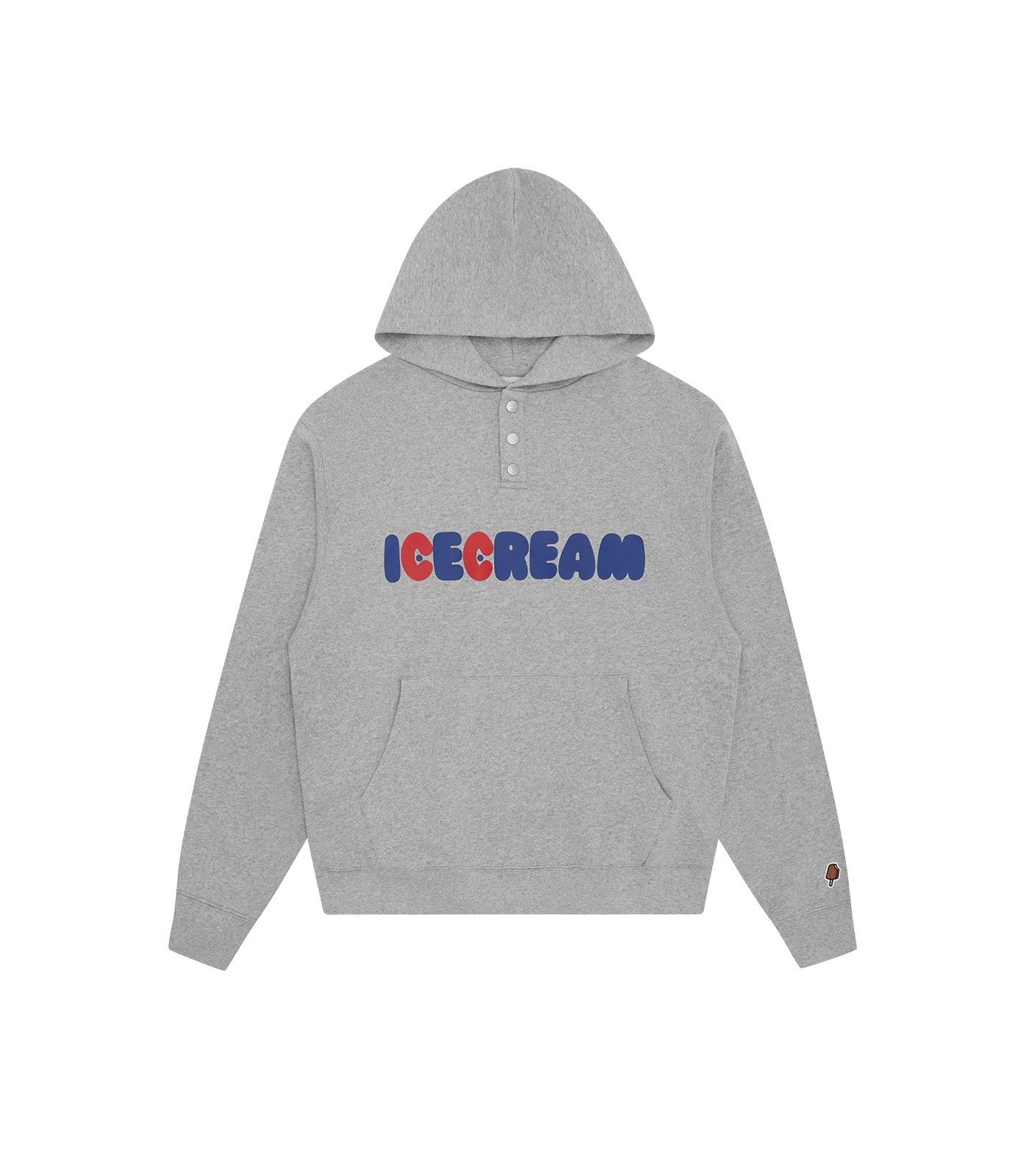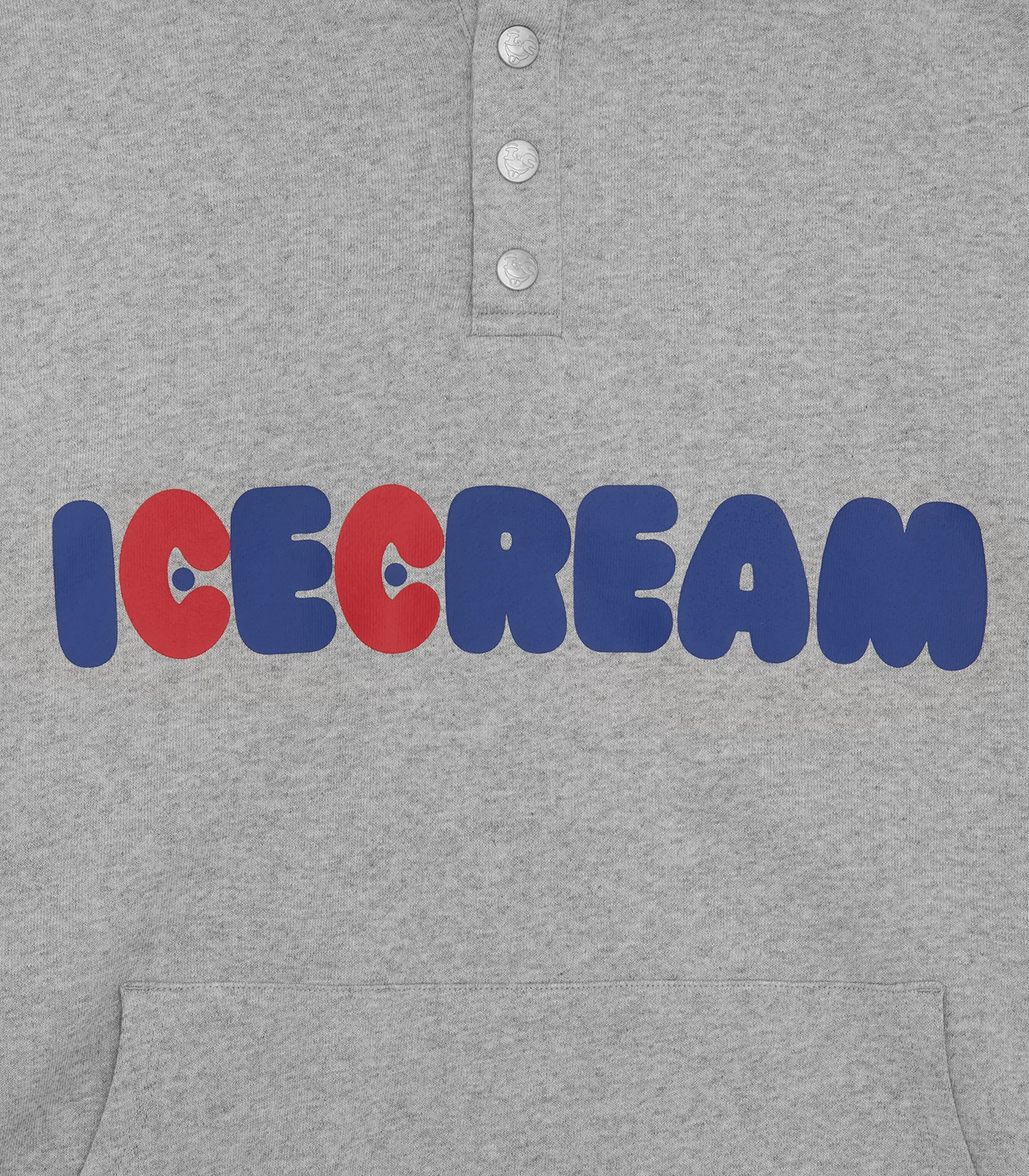 ICECREAM Spring ’24 – Donut Popover Hood featuring a kangaroo pouch, detailed with a popper-fasten closure and ICECREAM logo at front. Matching sweatpants available.