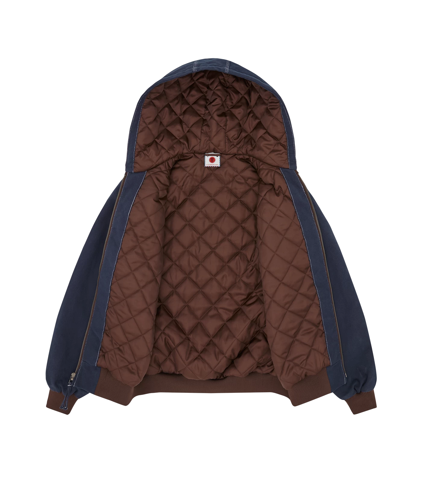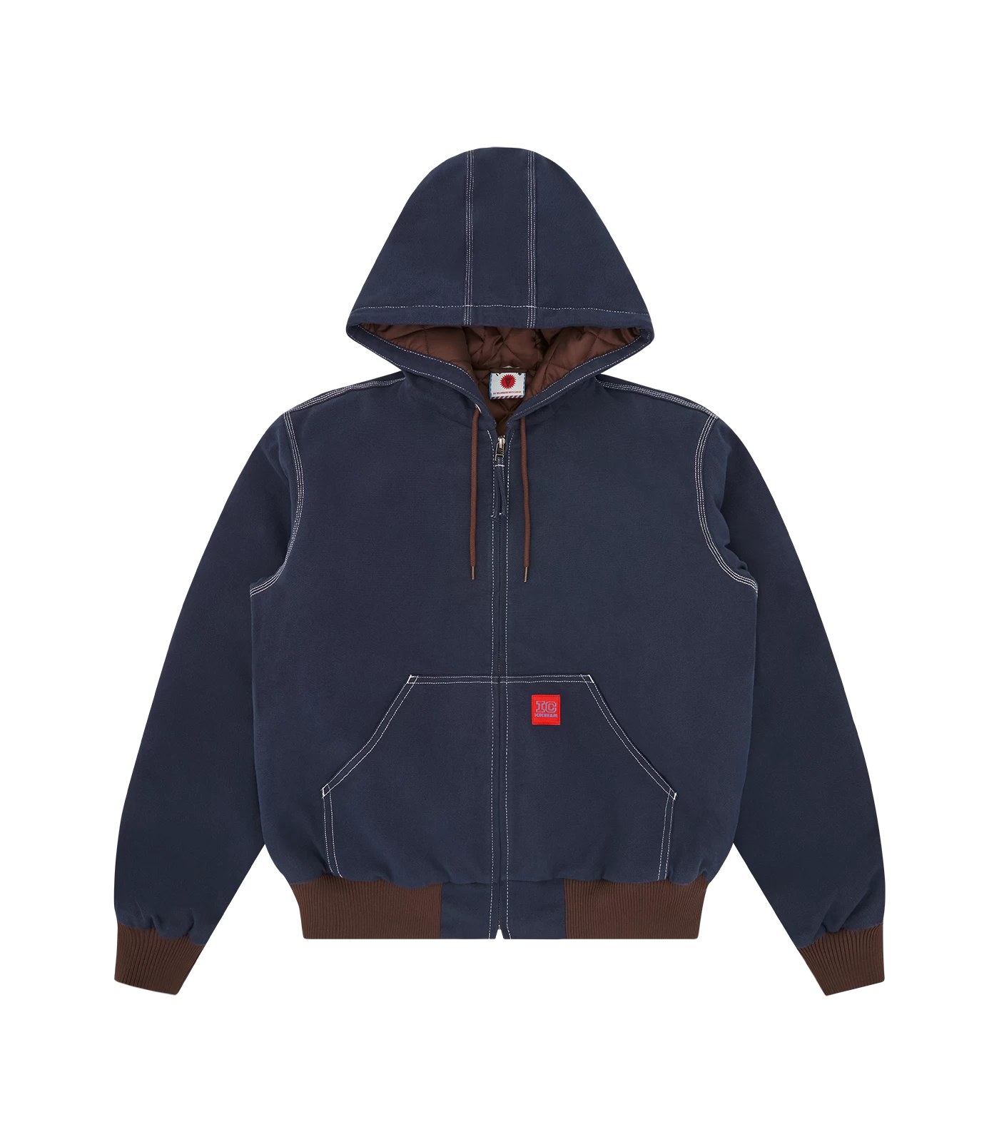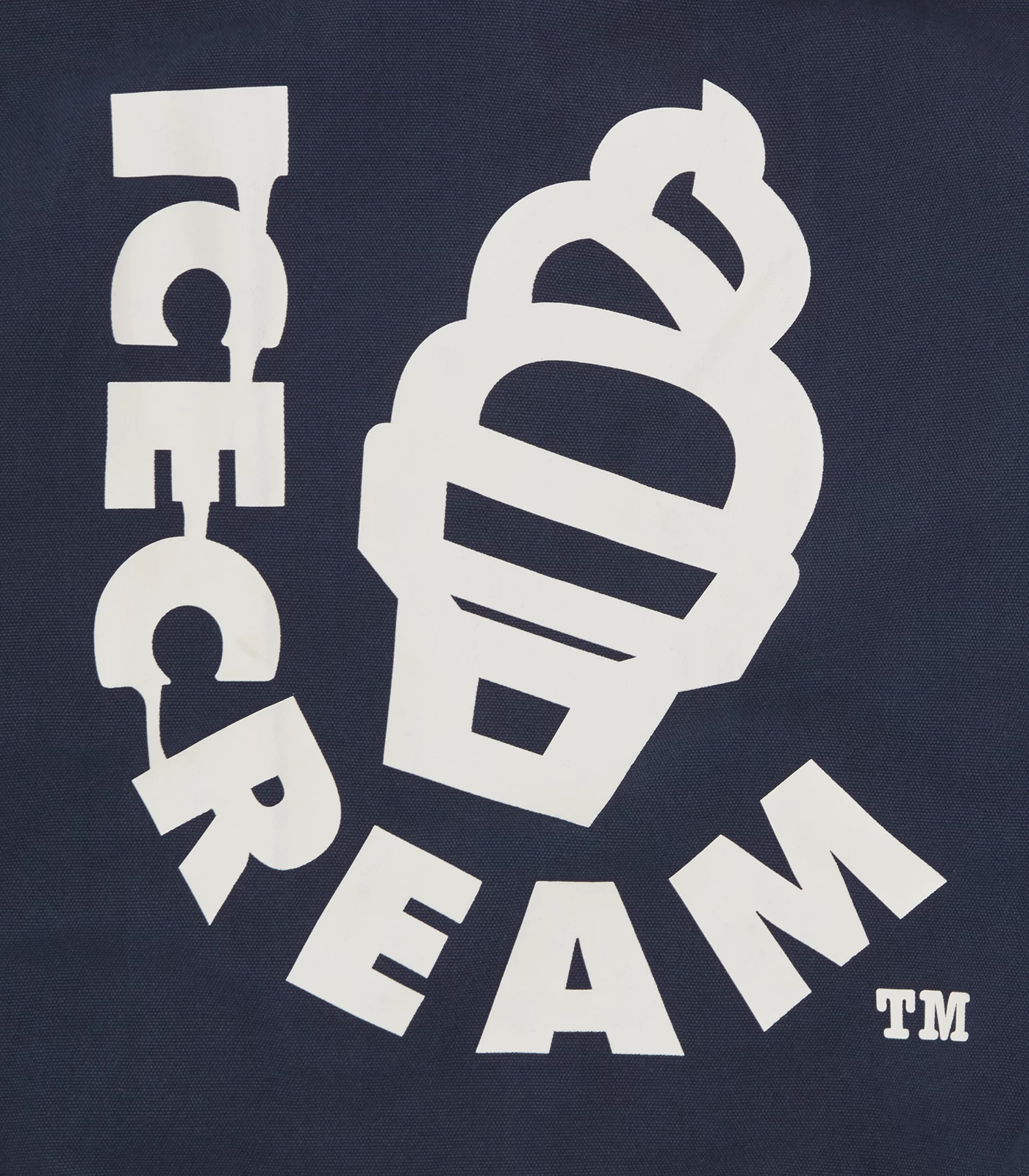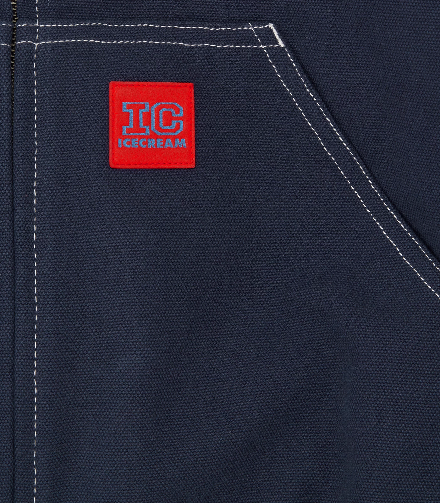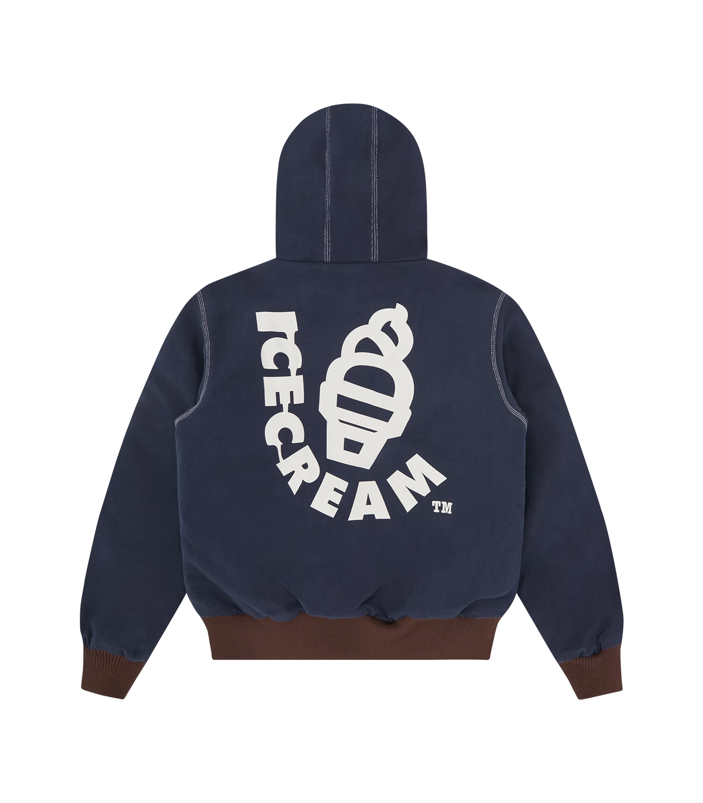 ICECREAM Spring ’24 – Quilted Hooded Work Jacket featuring a ICECREAM graphic at back in white and kangaroo pouch.