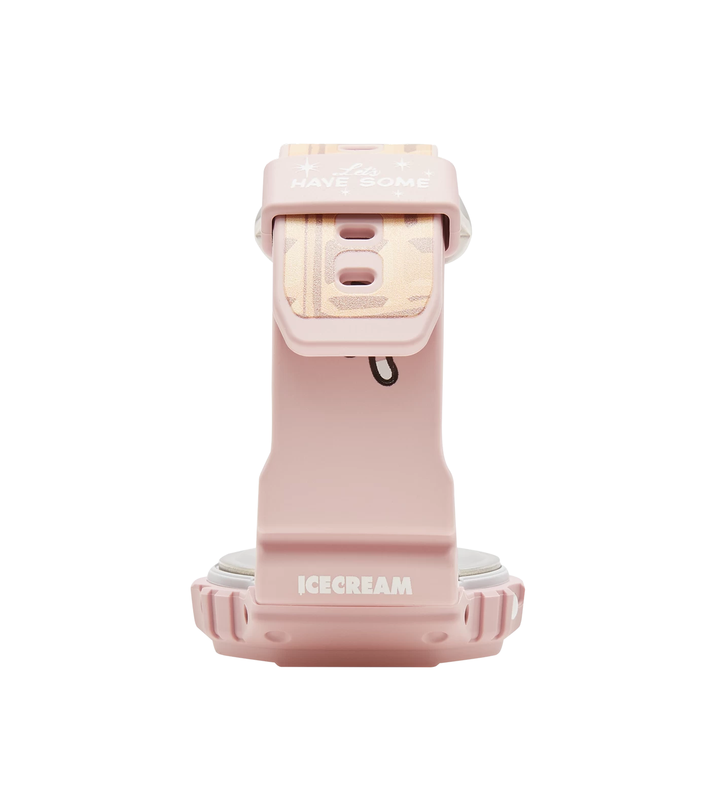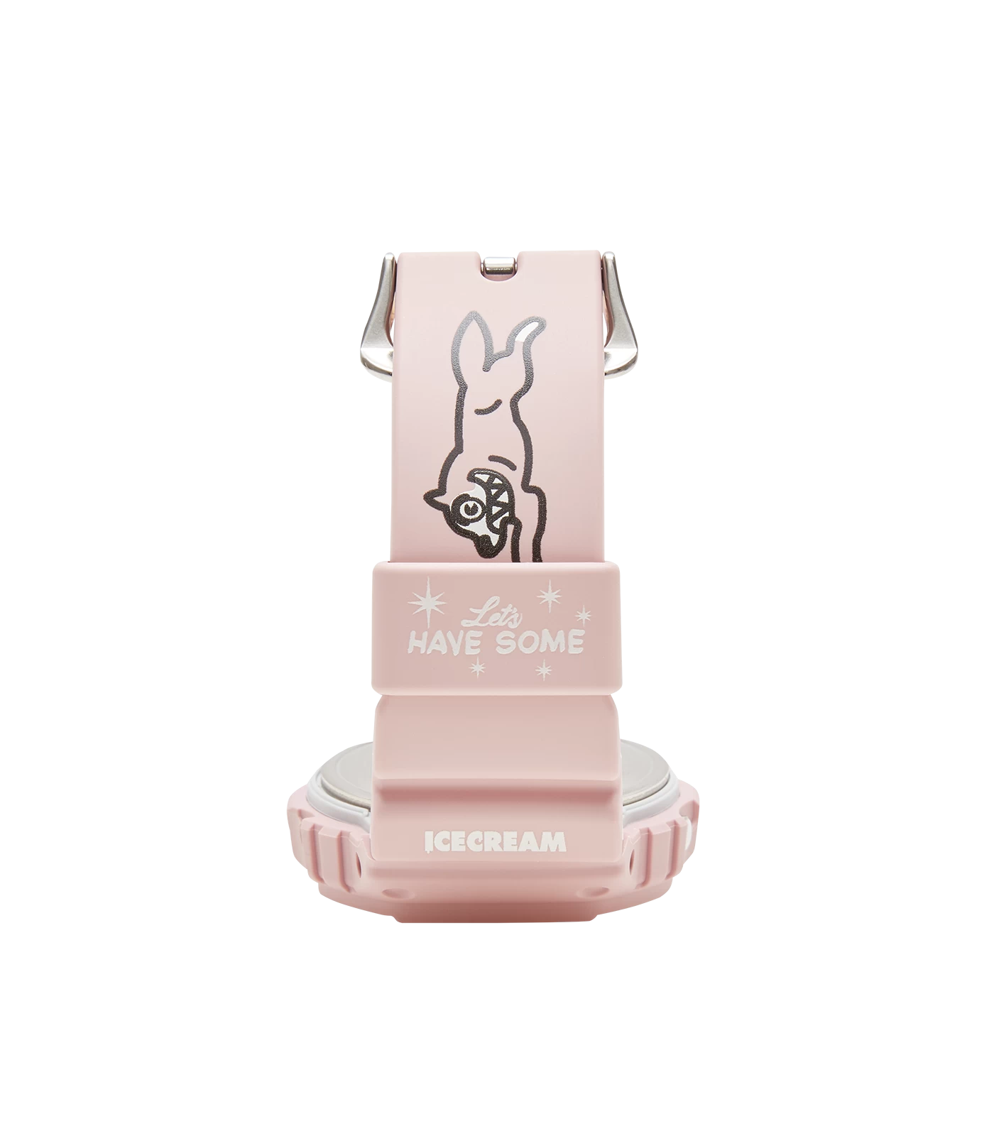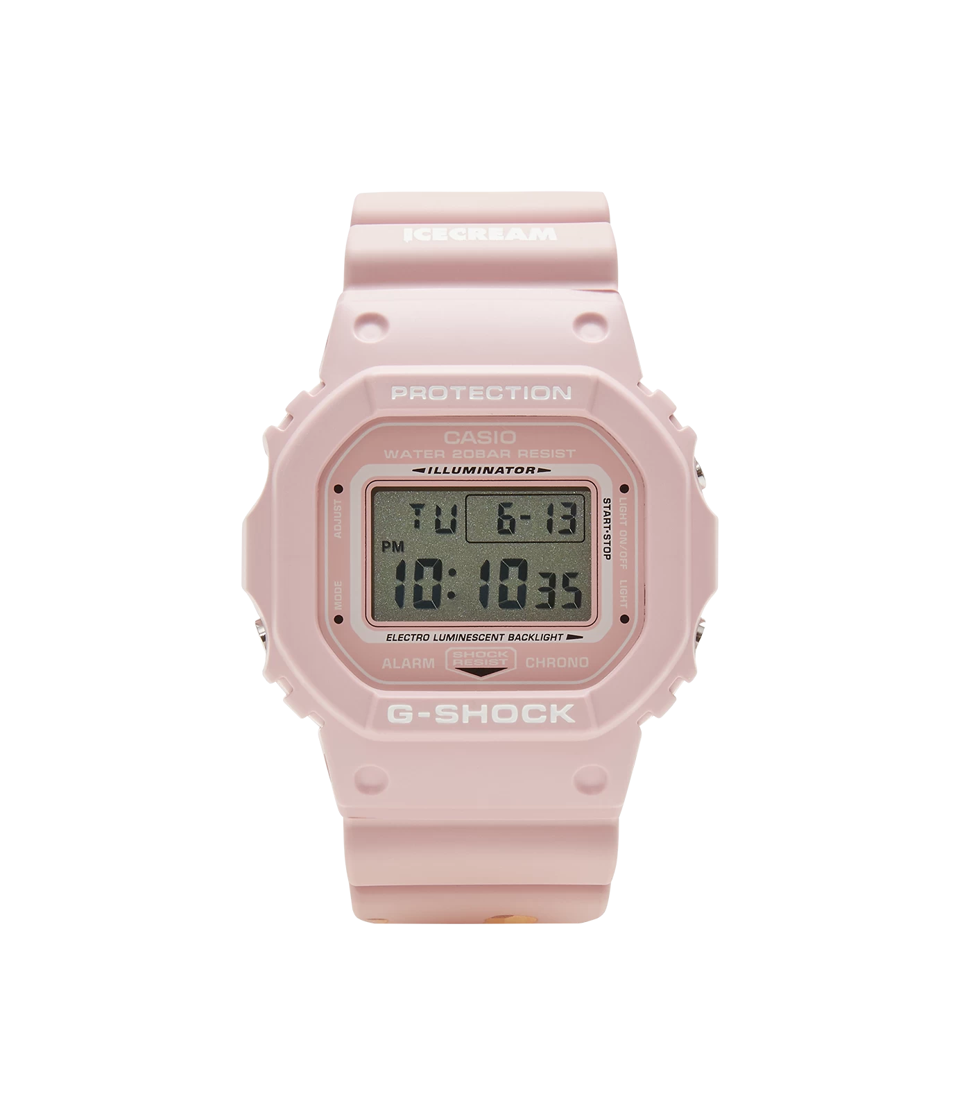 This Casio G-Shock watch in pink features the ICECREAM Waffle and Drip artwork on the band and face, with the classic ICECREAM Soft Serve logo etched on the back face of the watch’s bezel.