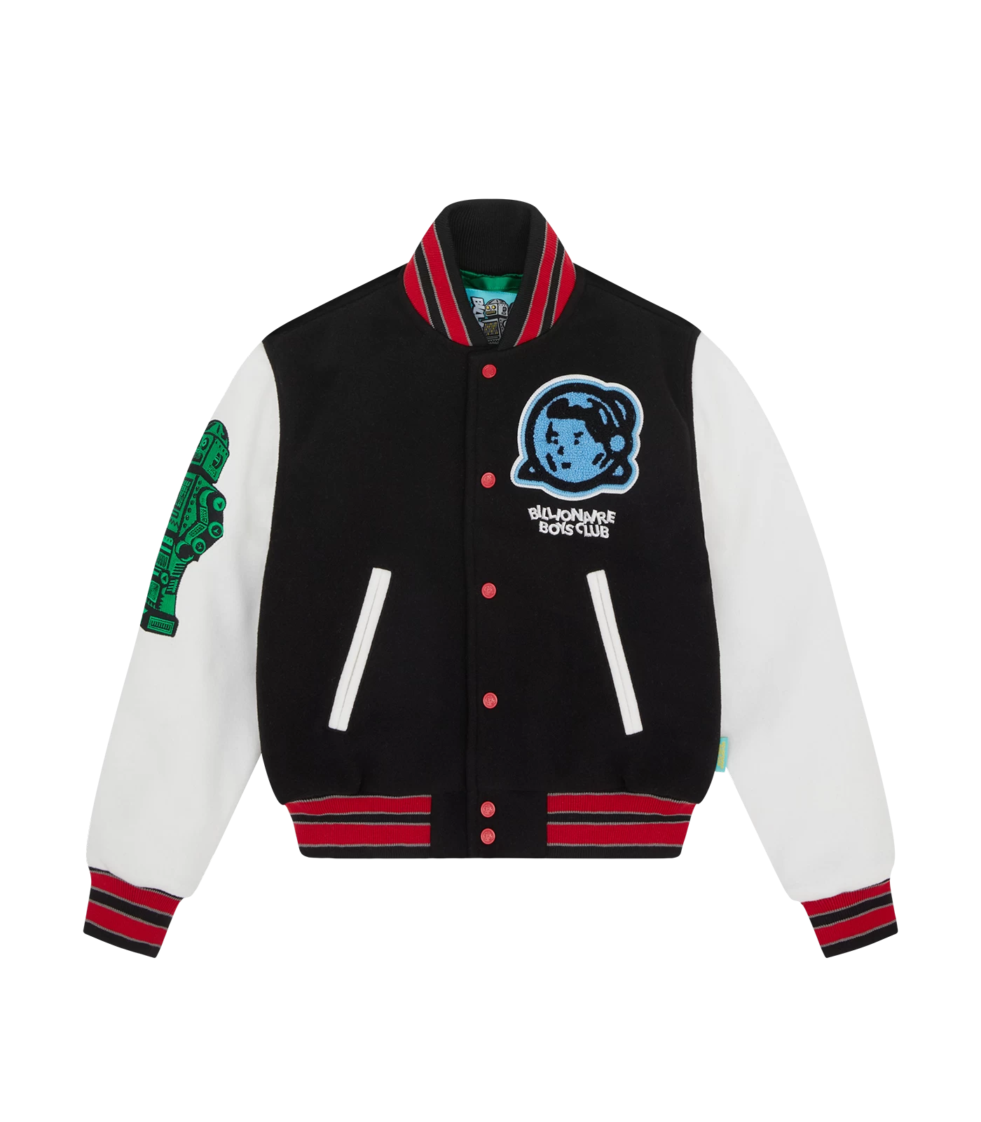 Billionaire Boys Club Kids Collection – Made in the classic Billionaire Boys Club Varsity Jacket style, this Astro Varsity Jacket features a chenille astro helmet logo patch and embroidered Billionaire Boys Club logo at chest, embroidered robot at right sleeve and a chenille astro helmet logo patch at back.