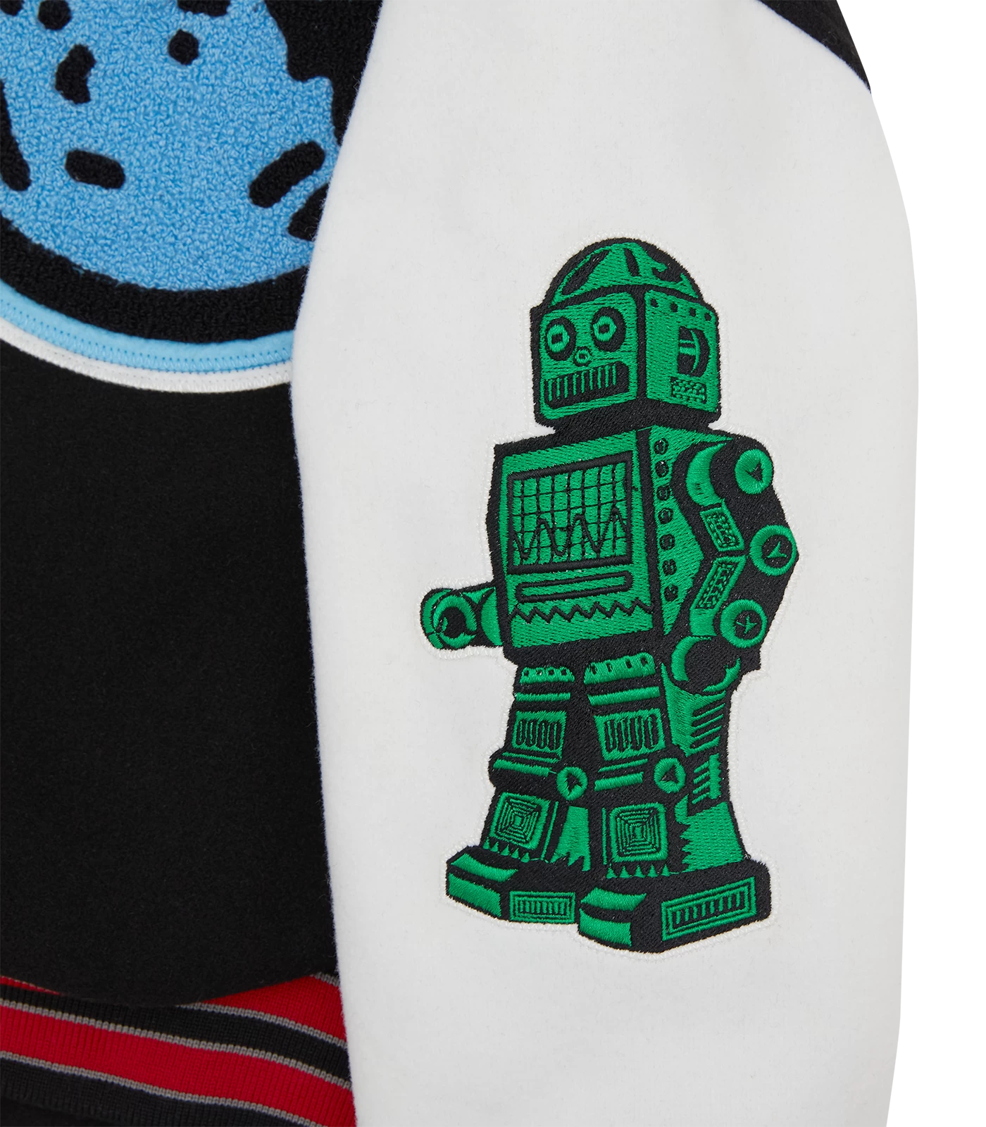 - Embroidered robot at right sleeve