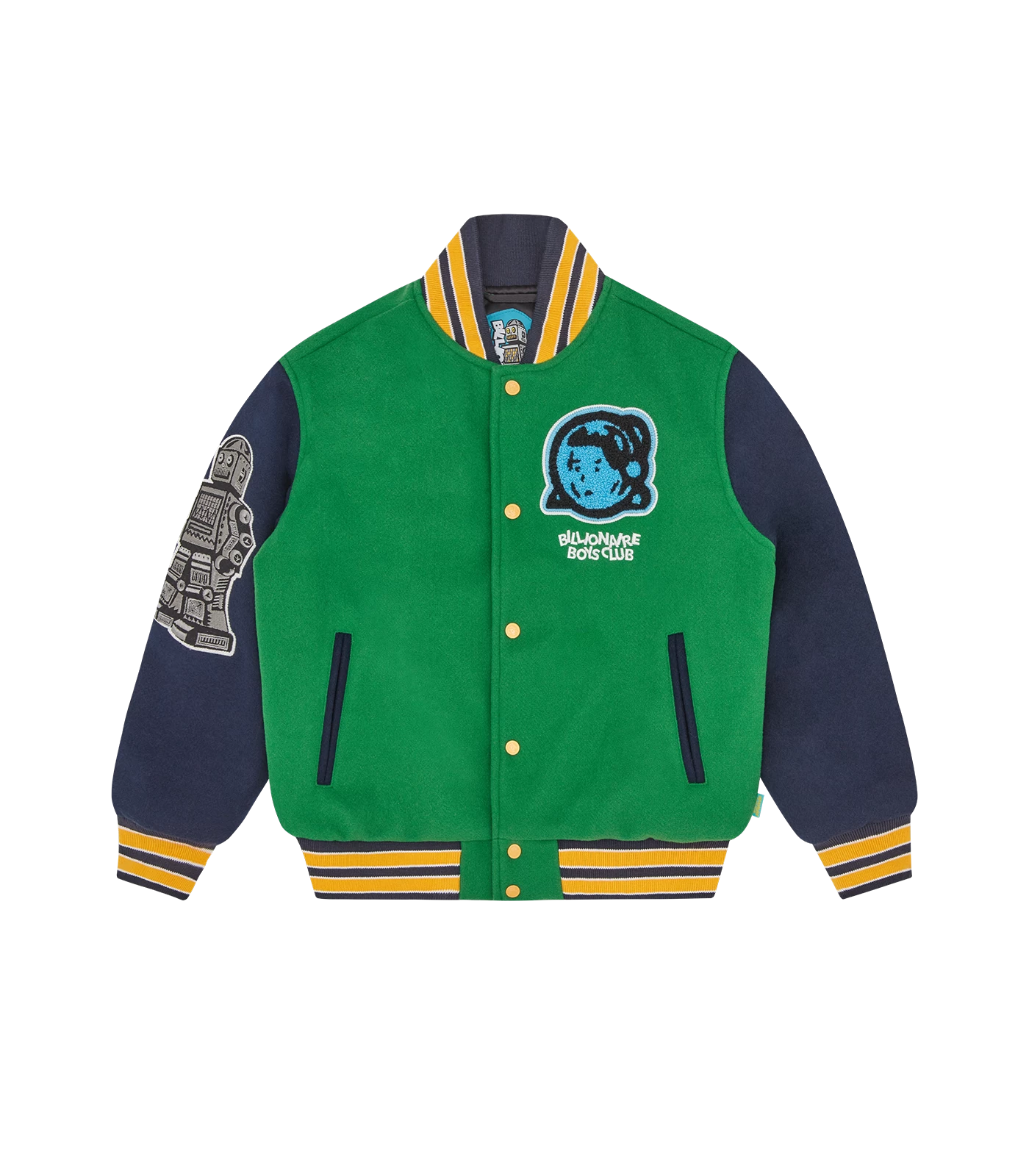 Billionaire Boys Club Kids Collection – Made in the classic Billionaire Boys Club Varsity Jacket style, this Astro Varsity Jacket features a chenille astro helmet logo patch and embroidered Billionaire Boys Club logo at chest, embroidered robot at right sleeve and a chenille astro helmet logo patch at back.