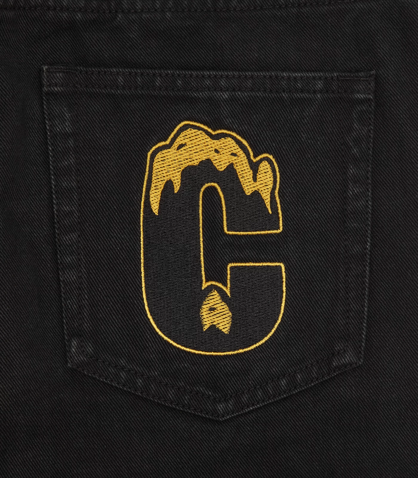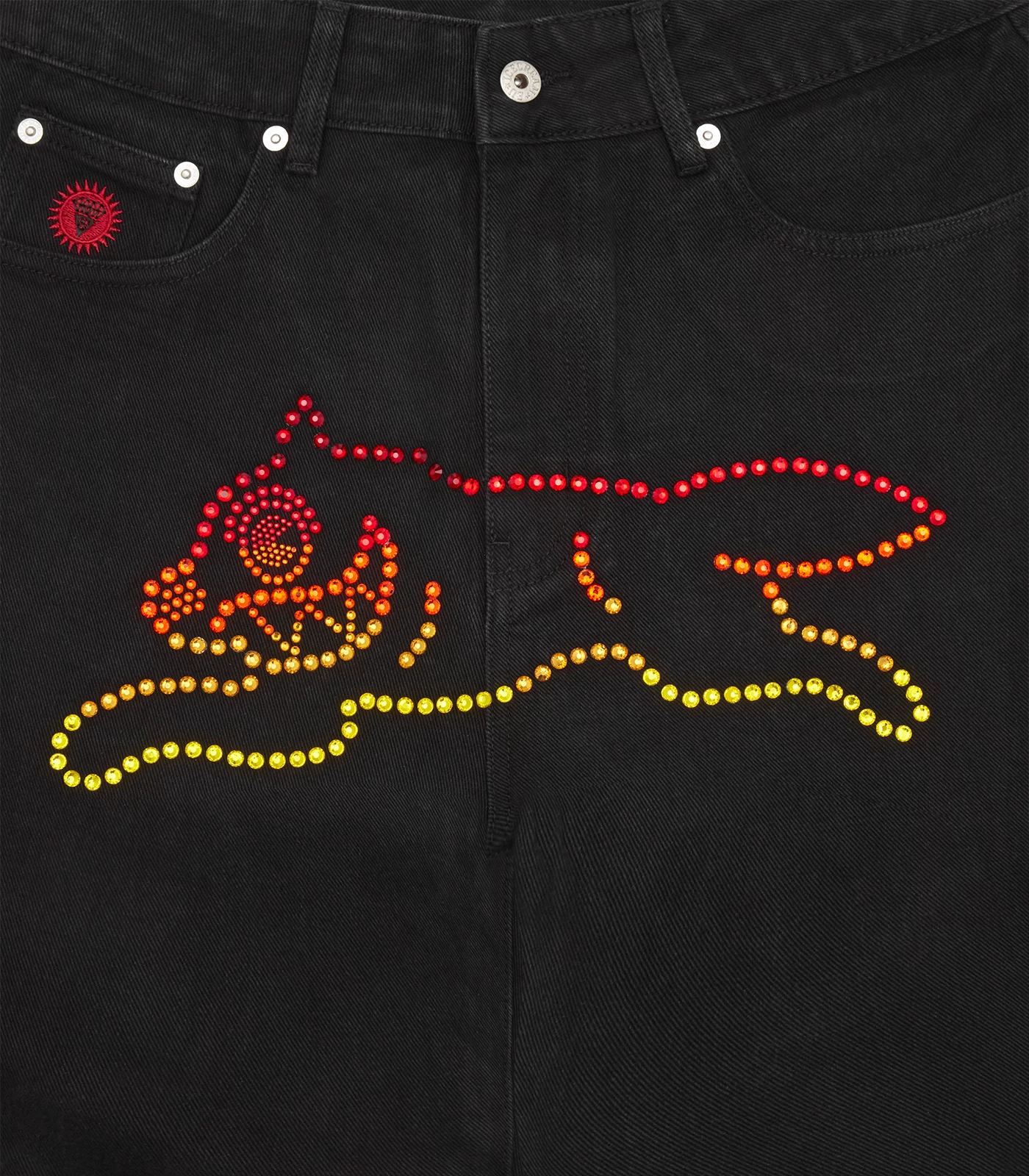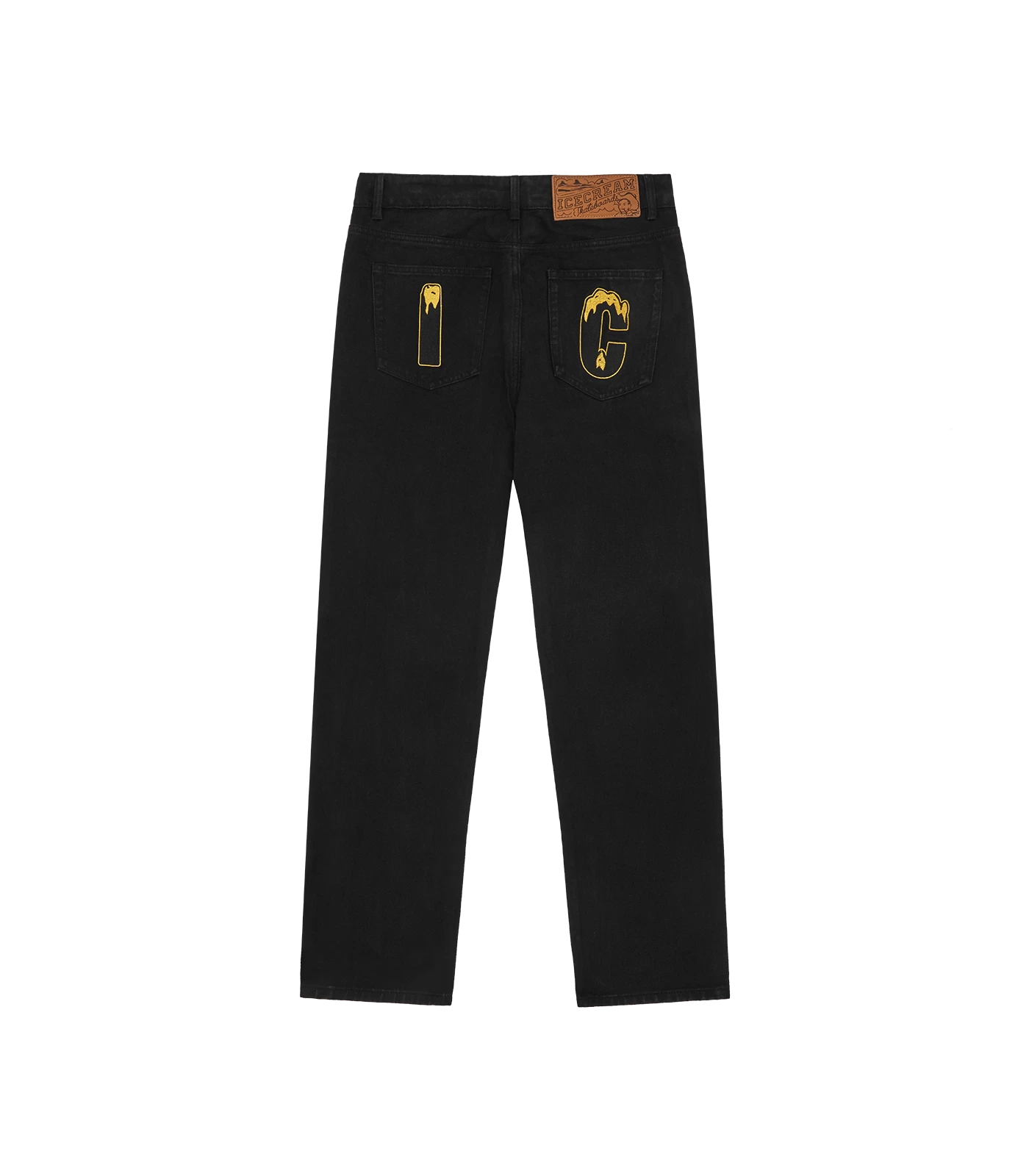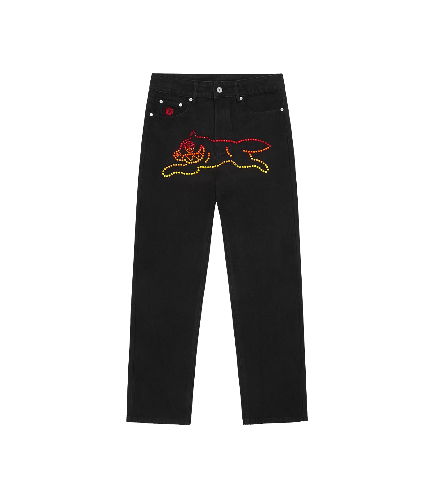 ICECREAM EU Exclusive – A an exclusive take on our iconic Running Dog Denim Pant, this one was made from 100% black denim, featuring a gradient rhinestone running dog graphic on the front, embroidered IC signet, embroidered “IC” lettering on the back pockets, and a zip-fastened fly.