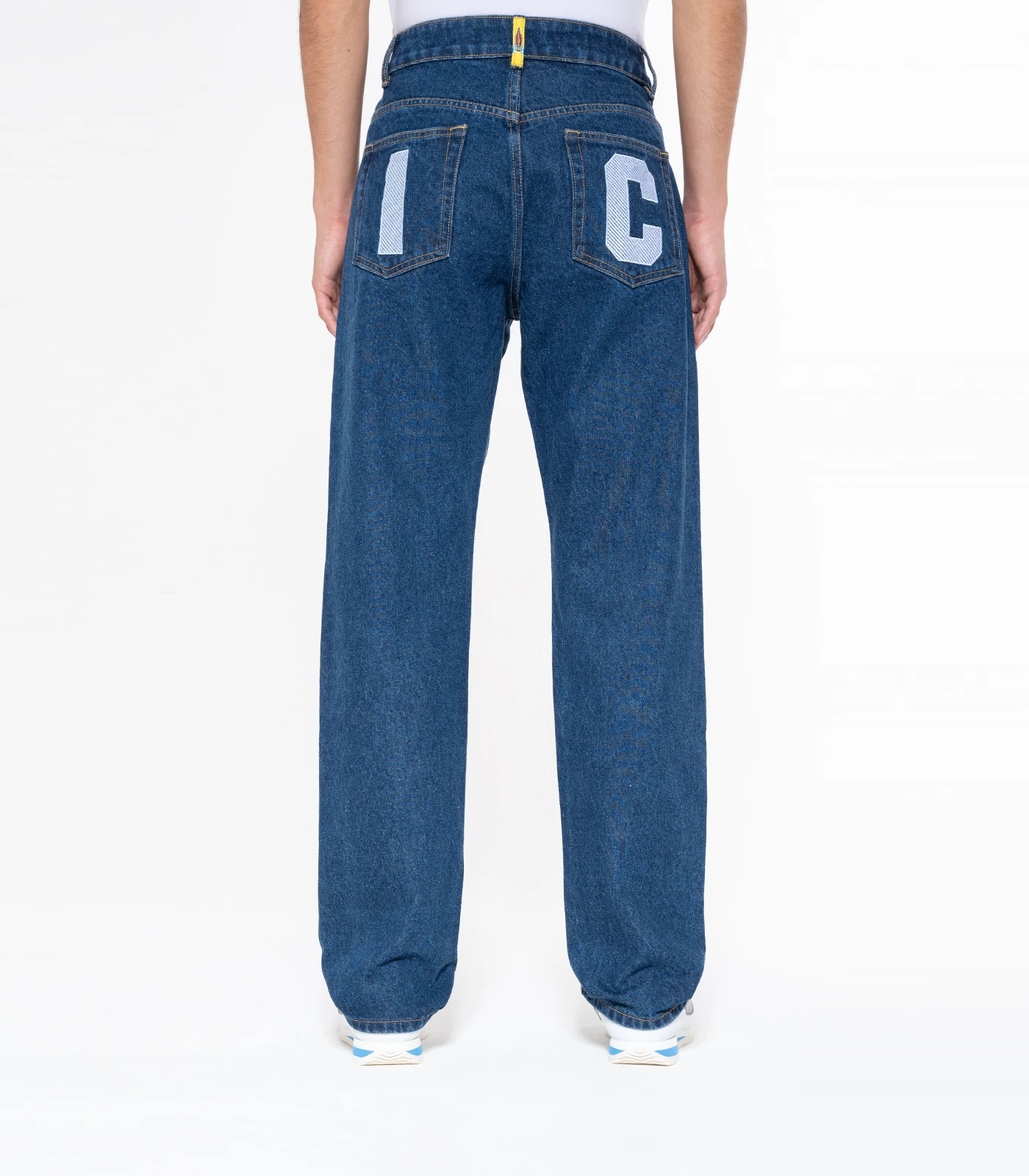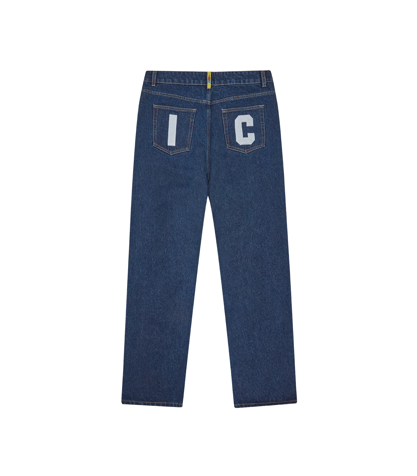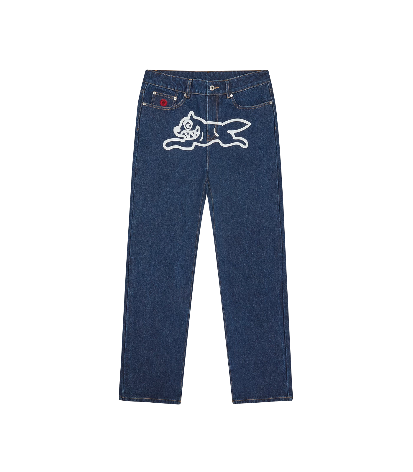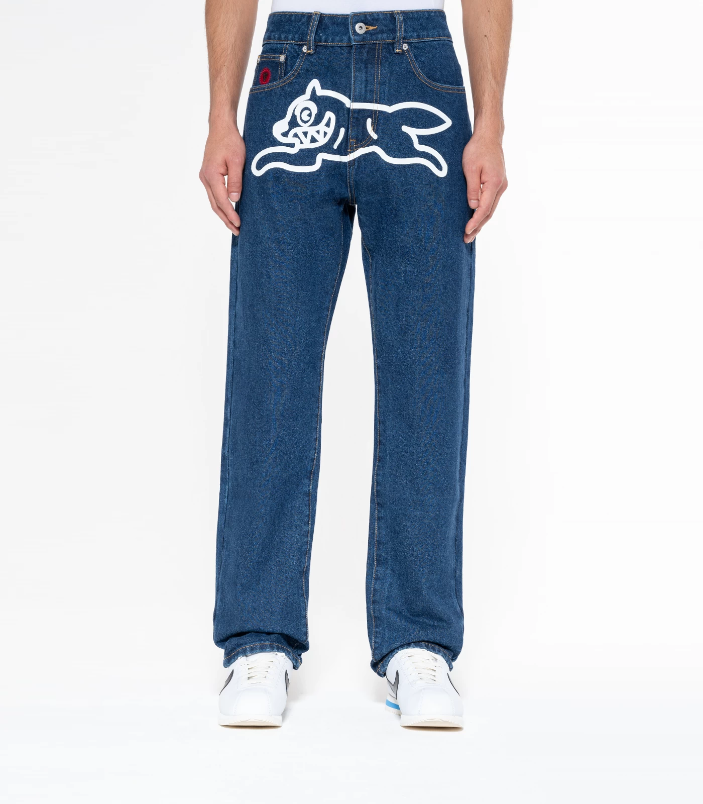 ICECREAM – Running Dog Denim Pant, feature a screen-printed running dog graphic on the front, embroidered IC signet, embroidered “IC” lettering on the back pockets, and a zip-fastened fly.