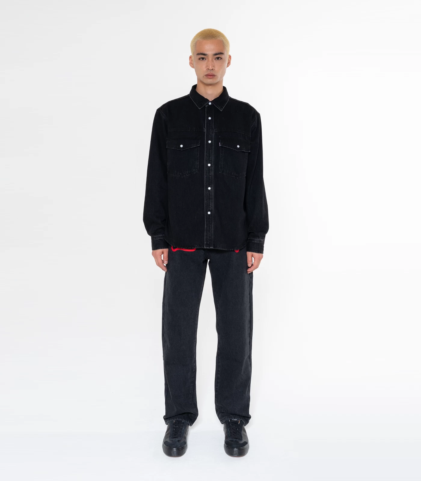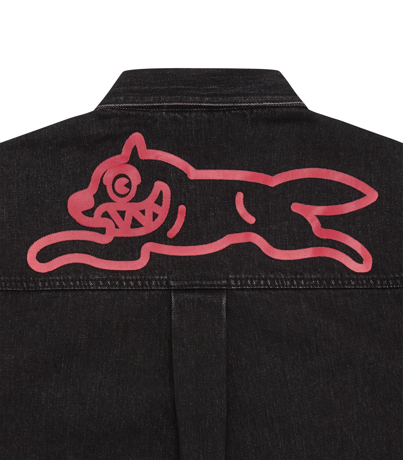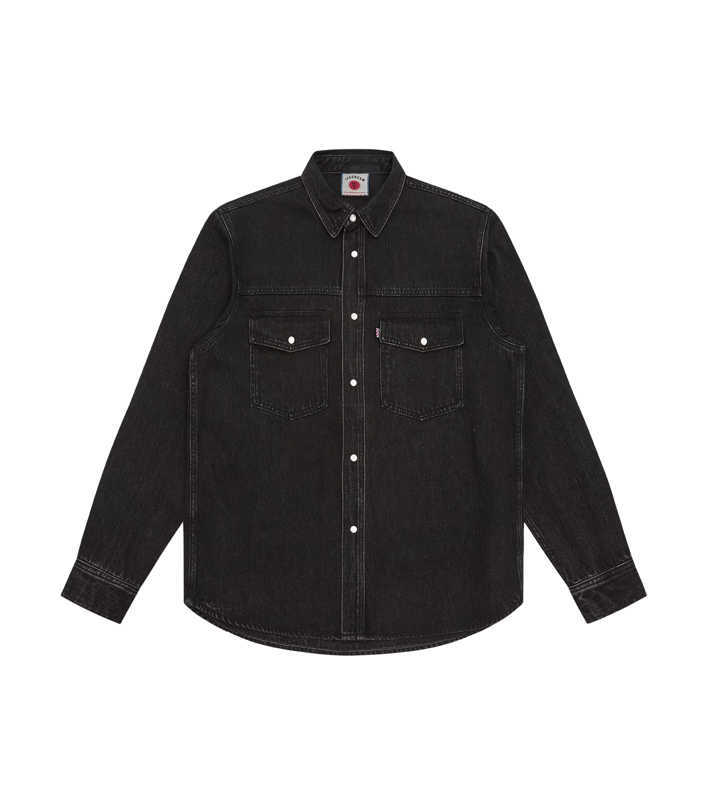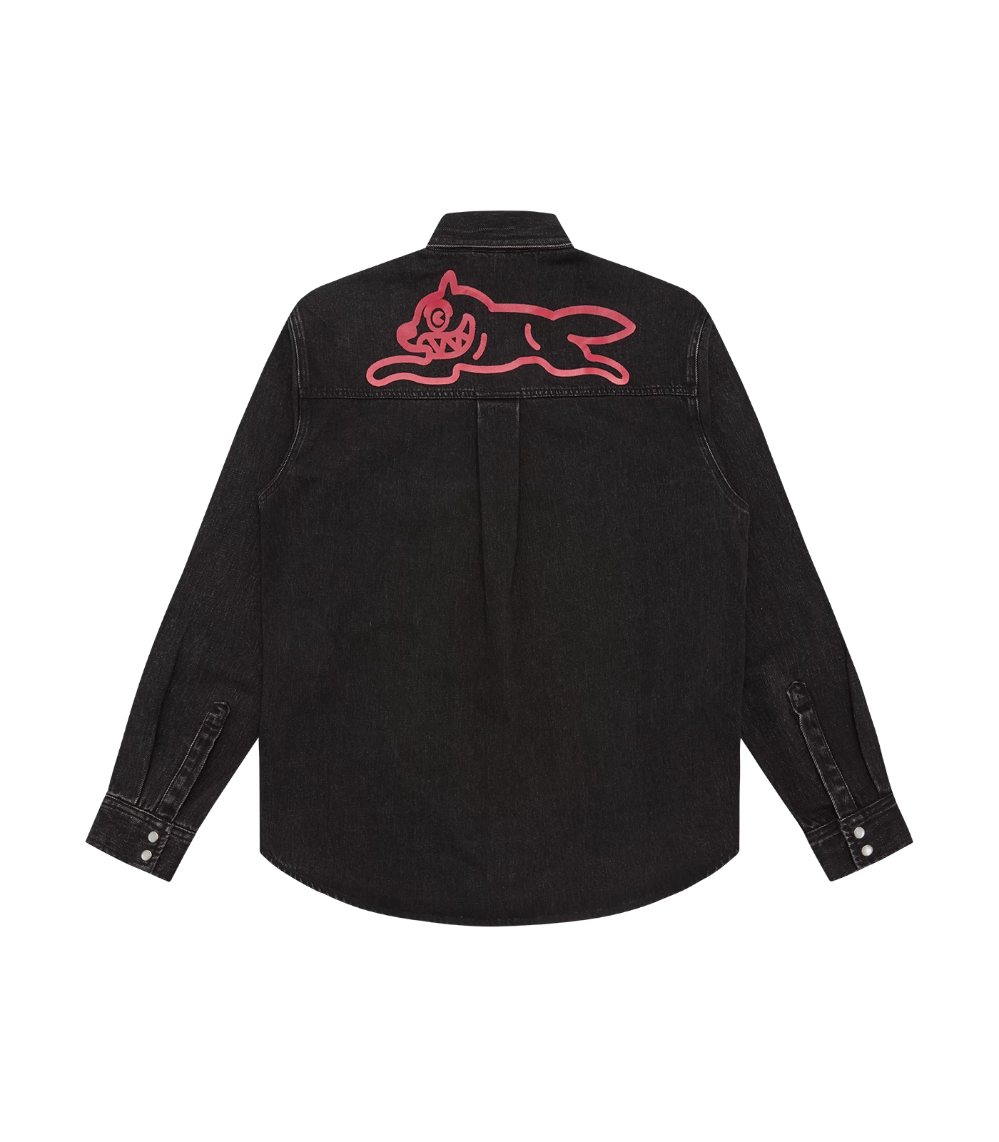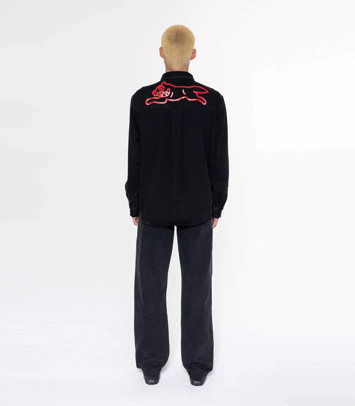 ICECREAM – The Running Dog Denim Shirt utilises a black wash, featuring two chest pockets with a screen printed running dog at back.