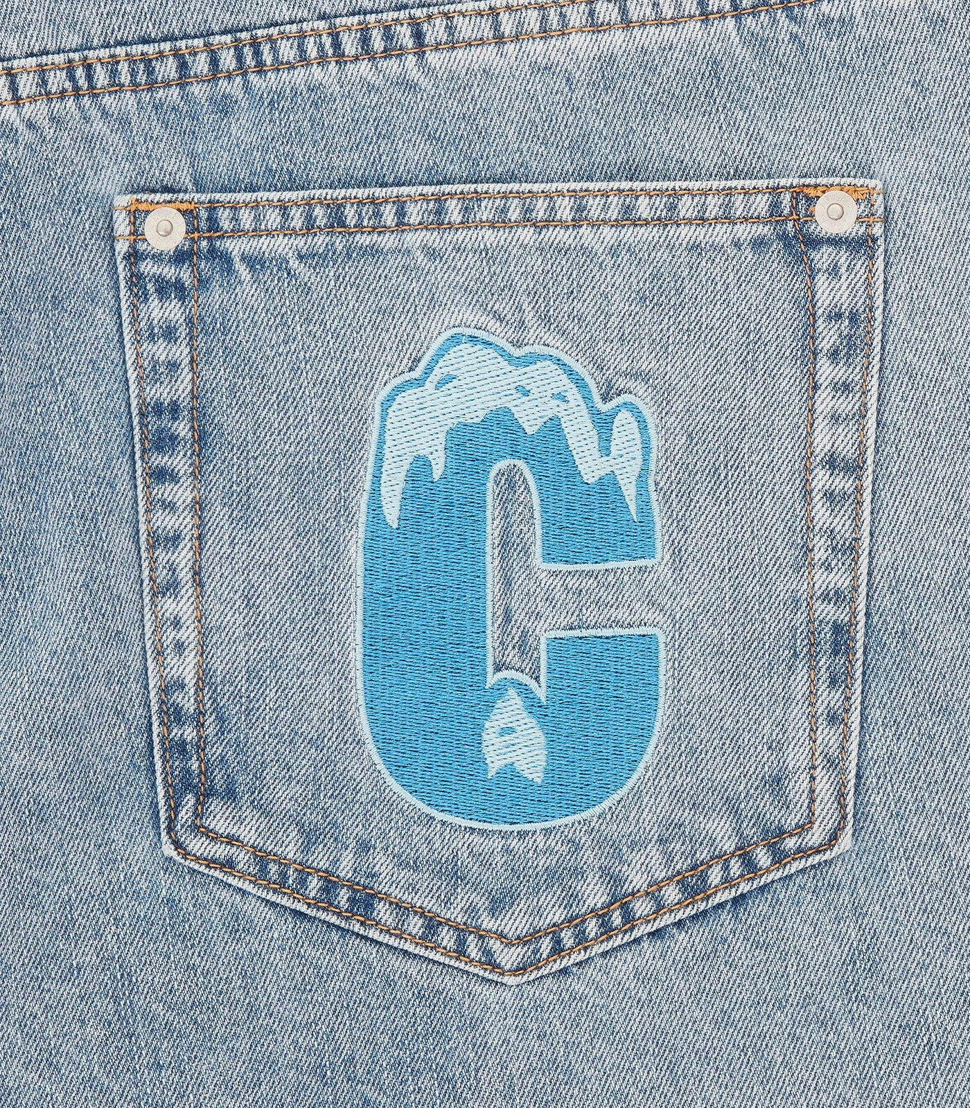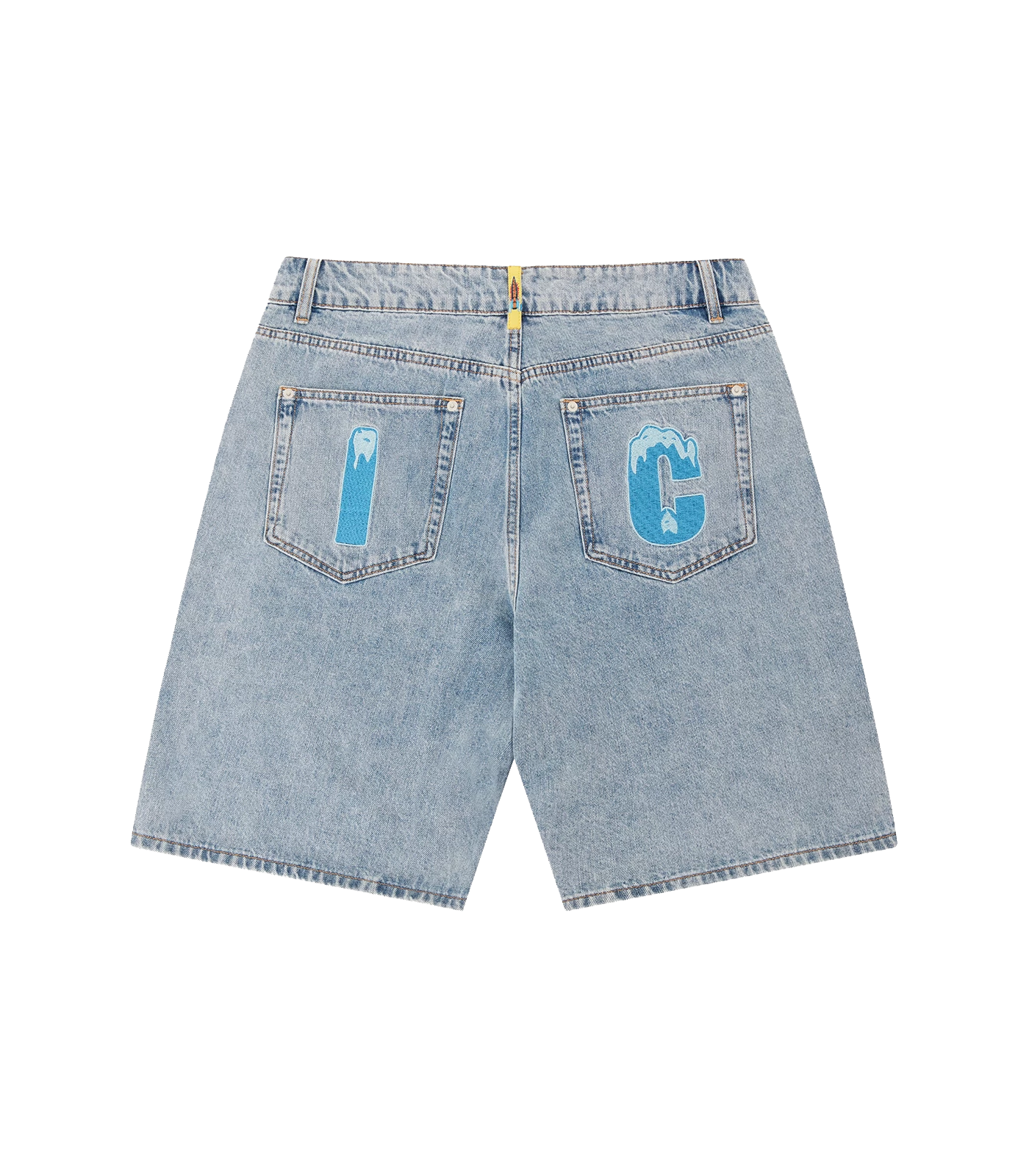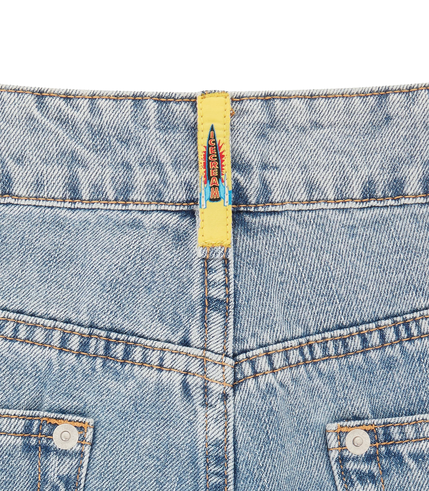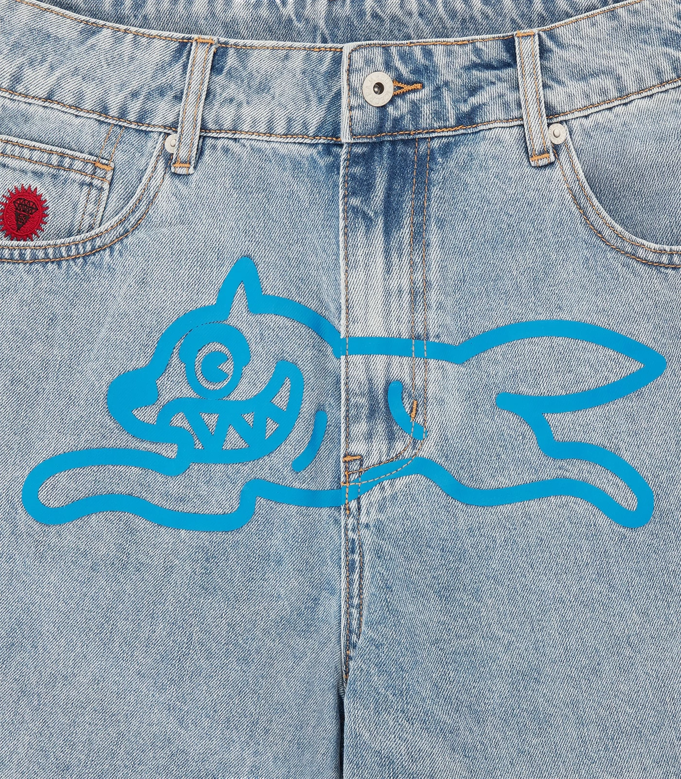 ICECREAM EU EXCLUSIVE – Running Dog Denim Shorts, featuring the iconic screen-printed running dog graphic on the front, embroidered IC signet, embroidered “IC” lettering on the back pockets, and a zip-fastened fly. This item is exclusively available on bbcicecream.eu.