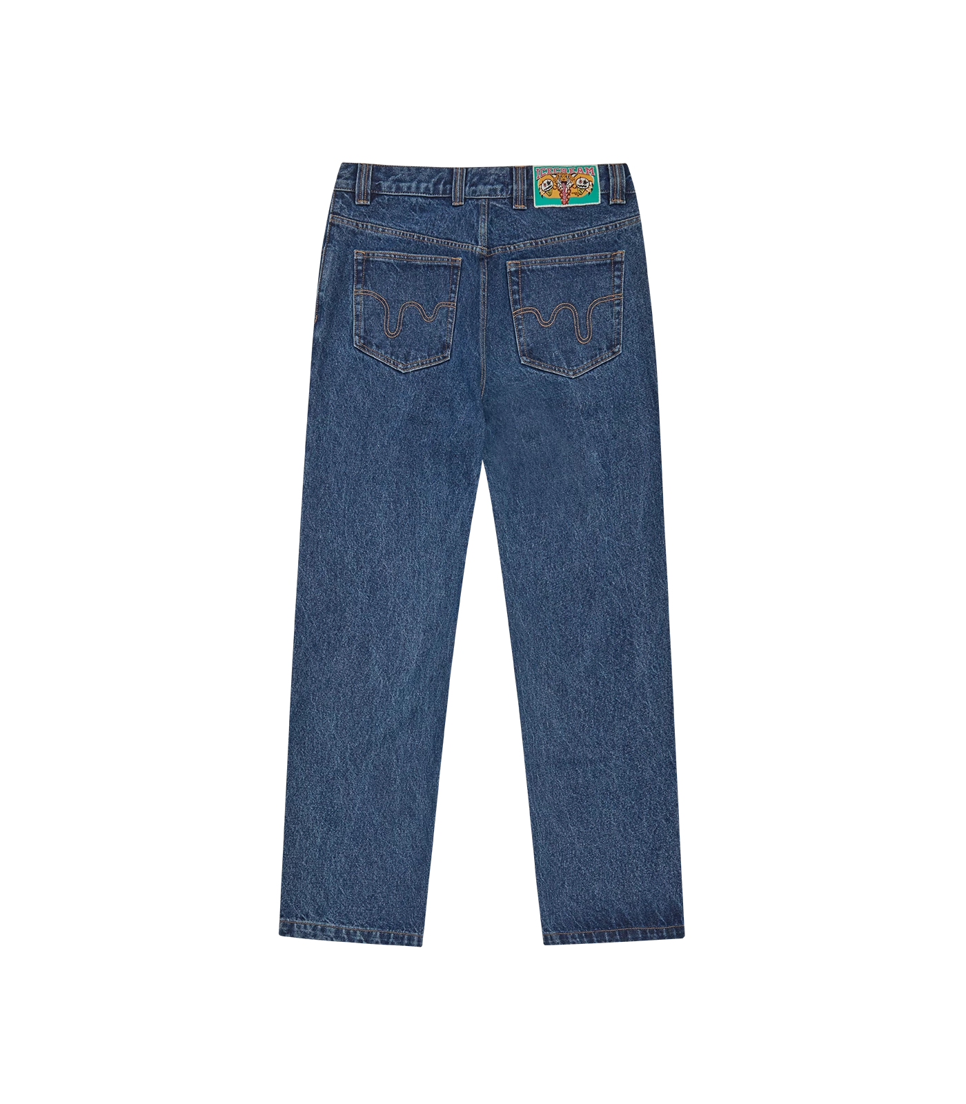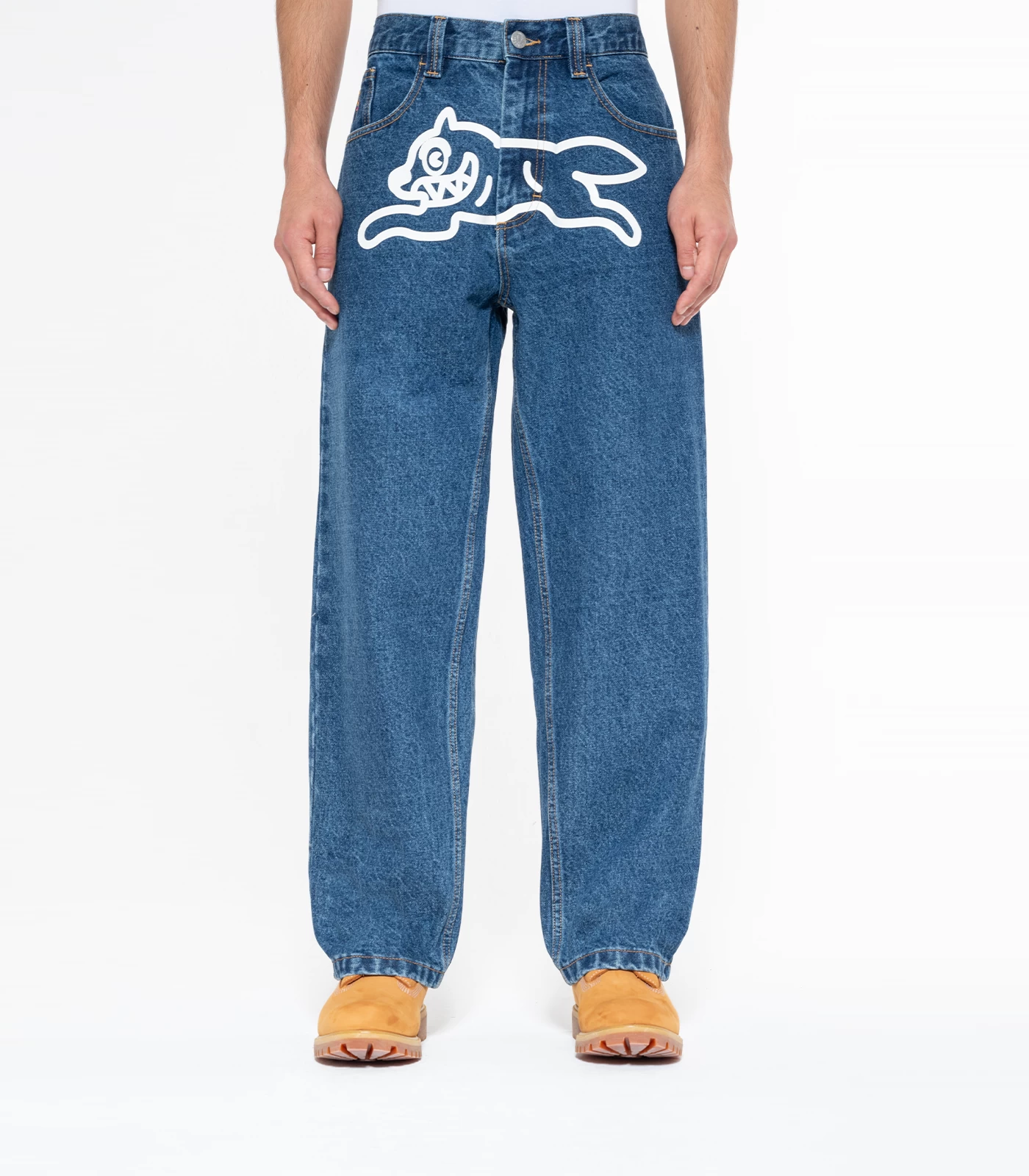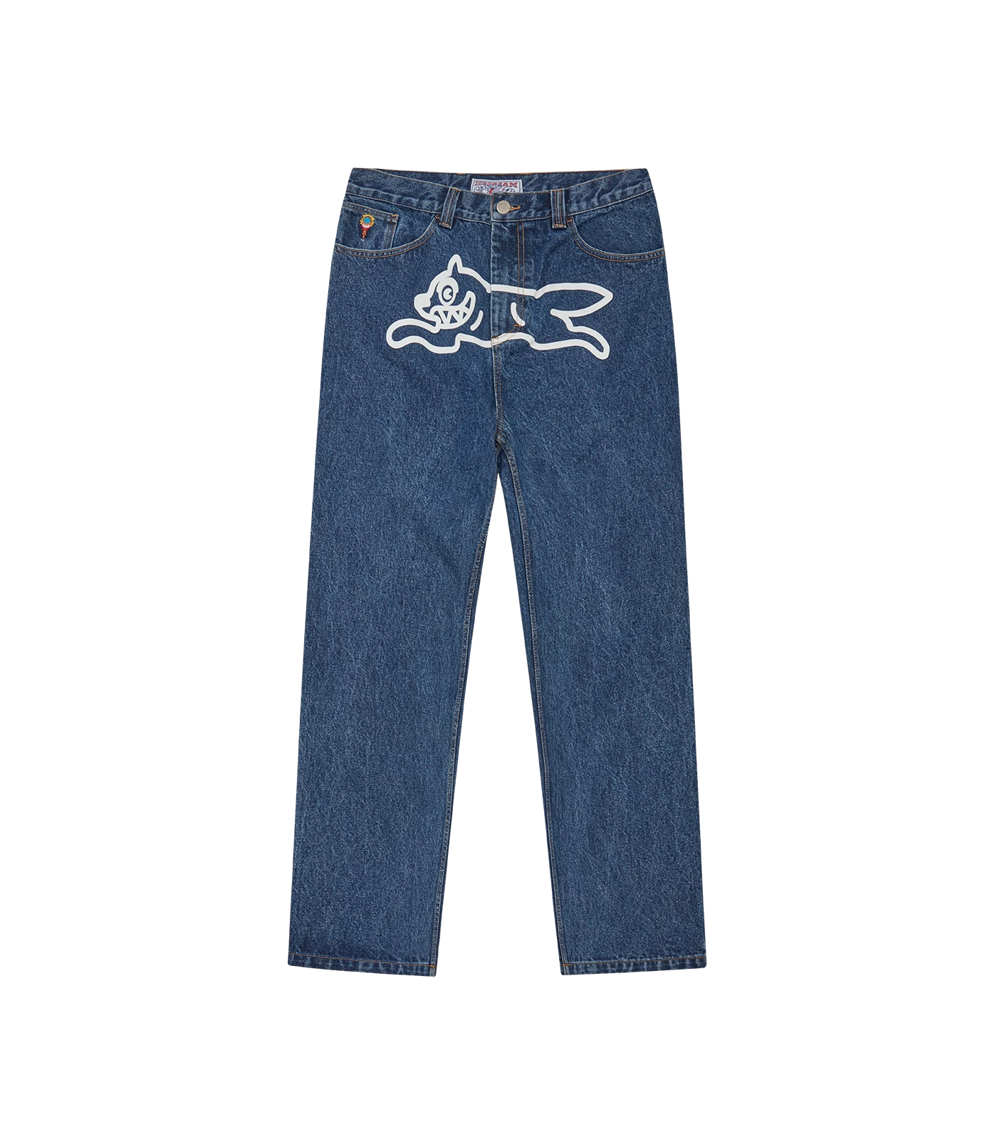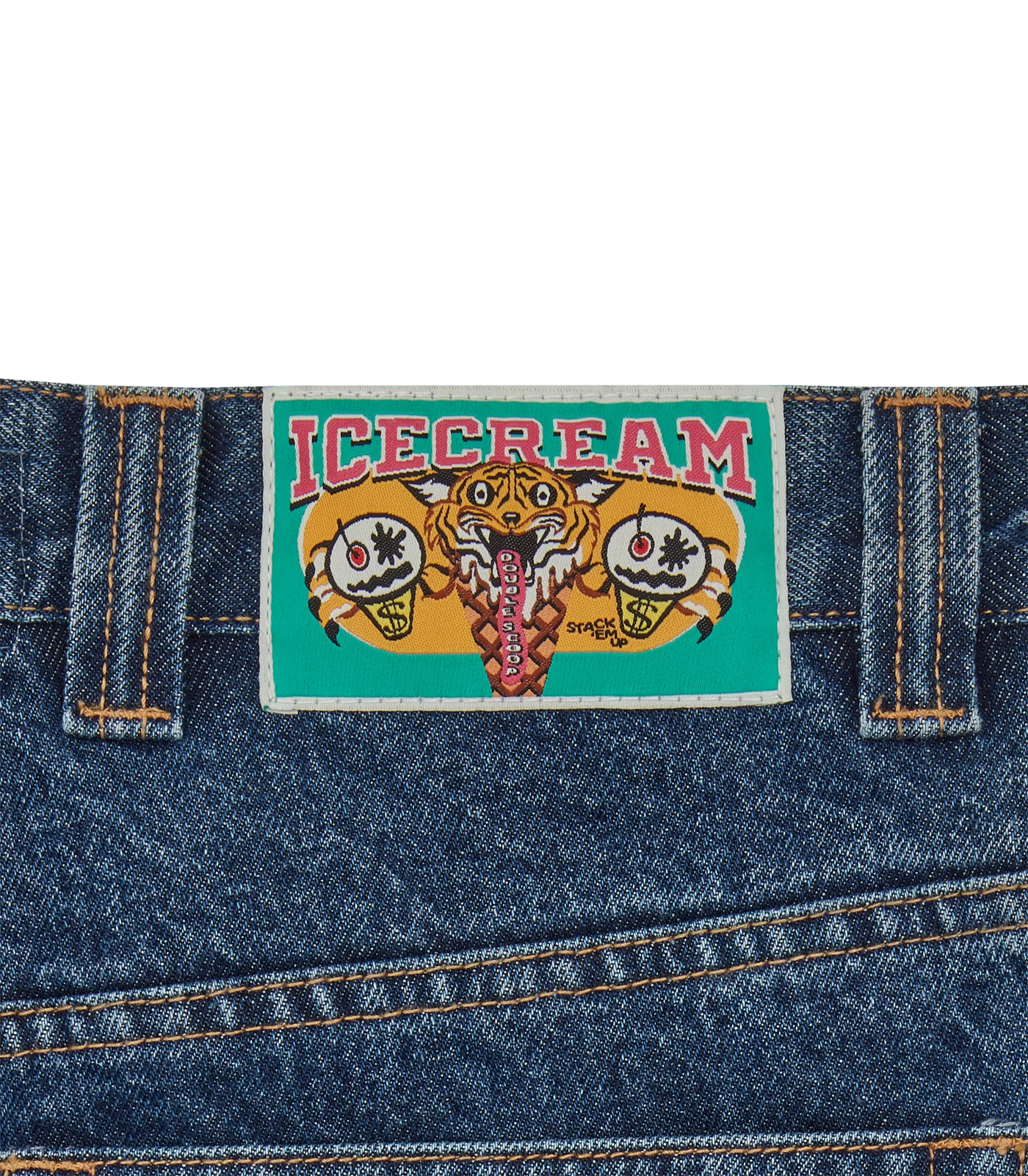 ICECREAM – Running Dog Double Scoop Denim Pant, feature a screen-printed running dog graphic on the front, embroidered double scoop signet at coin pocket and drip detailing on the back pockets. Zip-fastened fly.