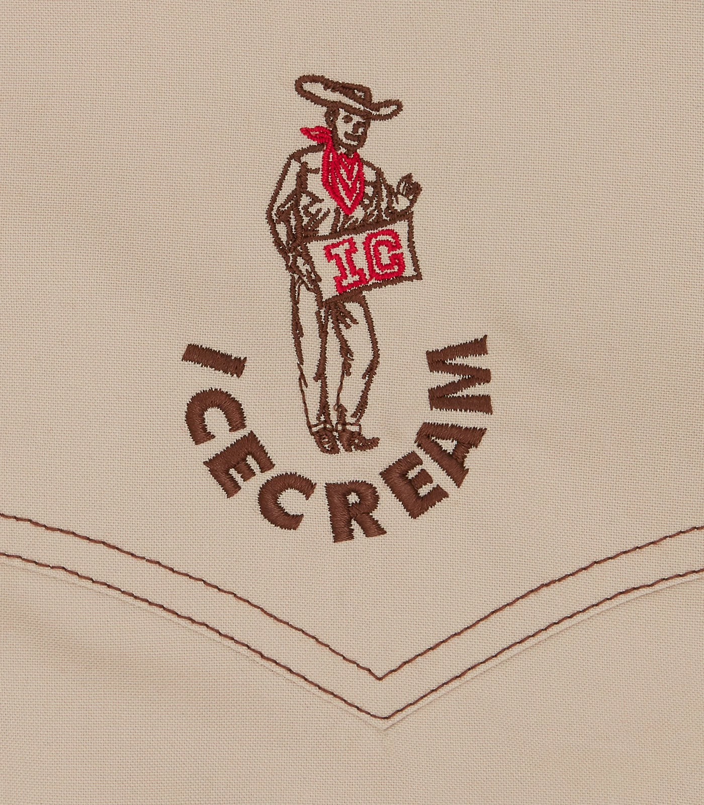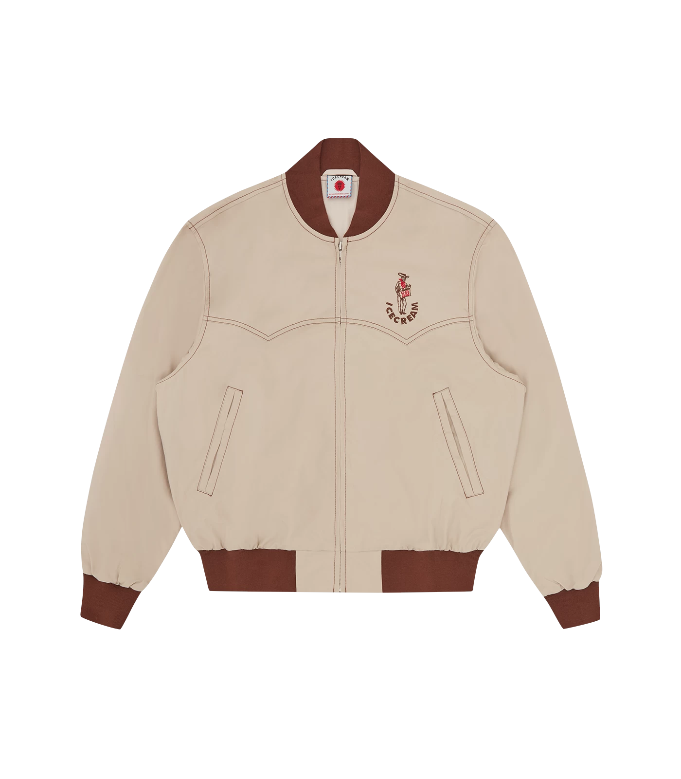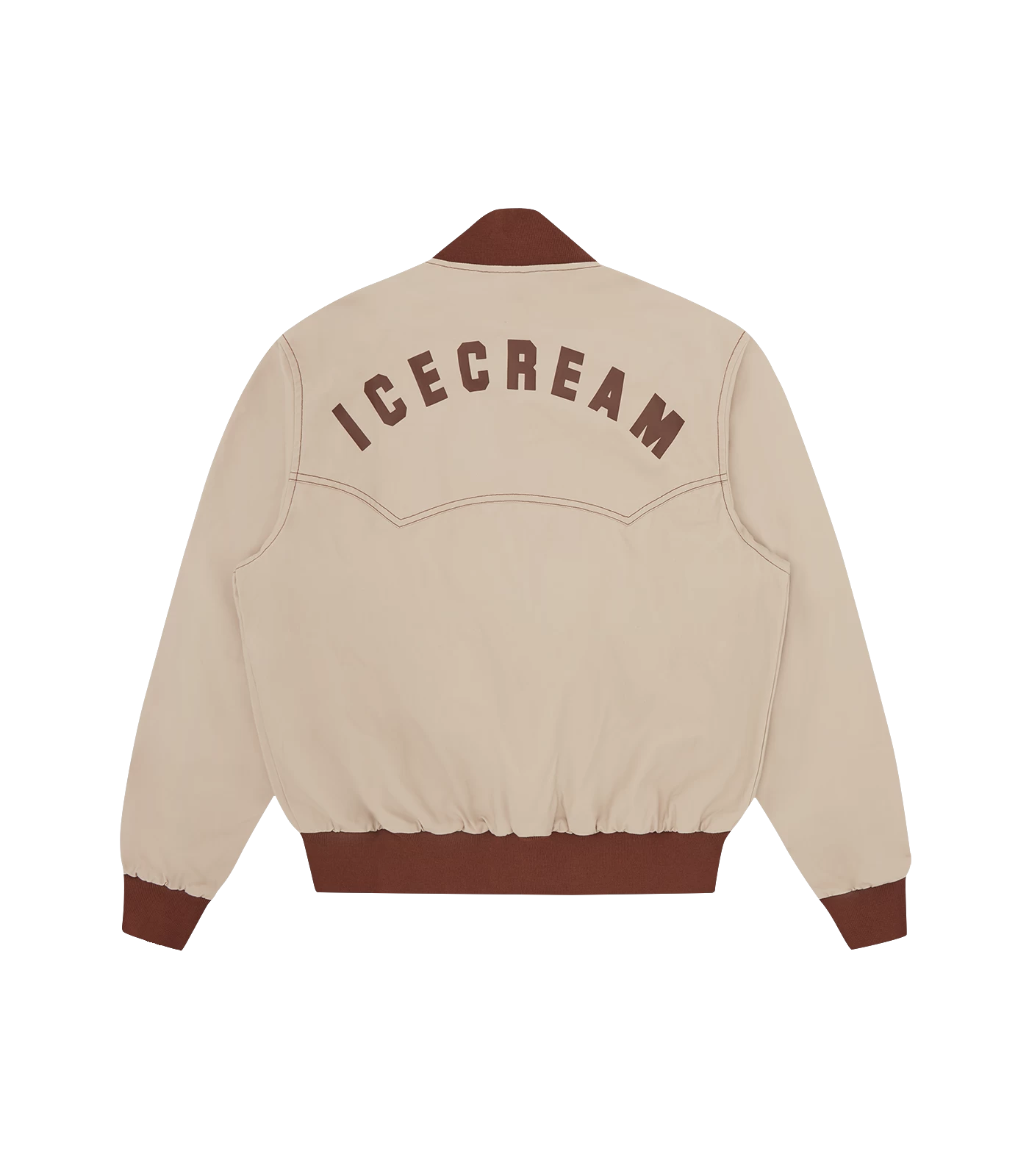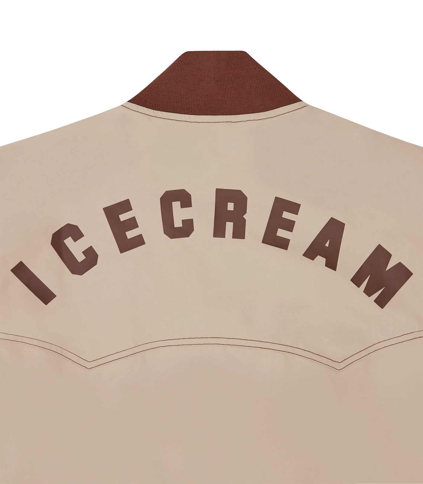 ICECREAM Pre-Fall ’24 – This Western Bomber Jacket presents an embroidered cowboy and logo at front, detailed with lettering at back and contrasting collar, cuffs and waist band.